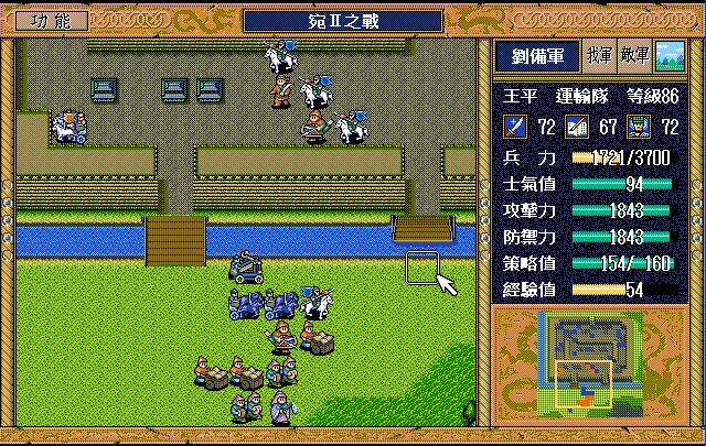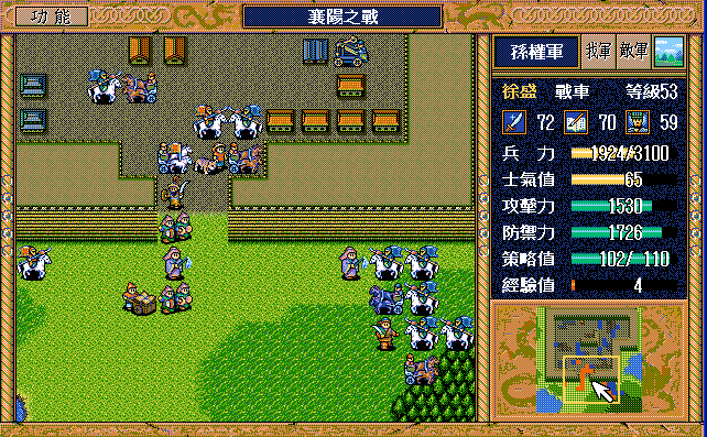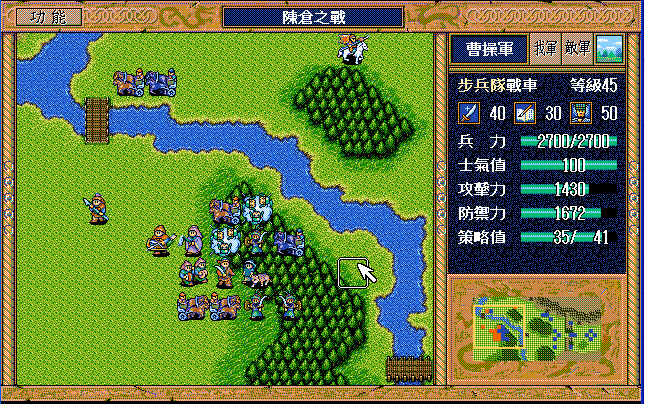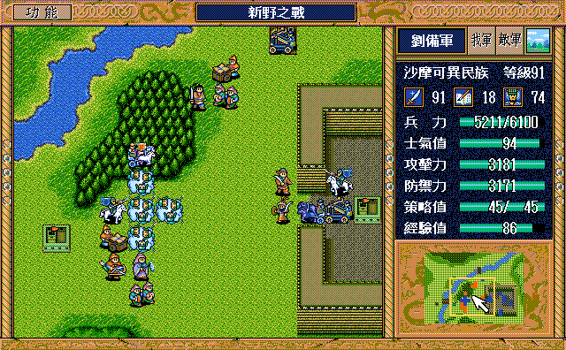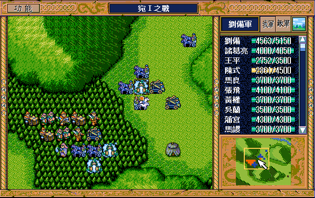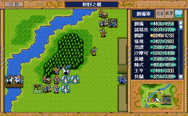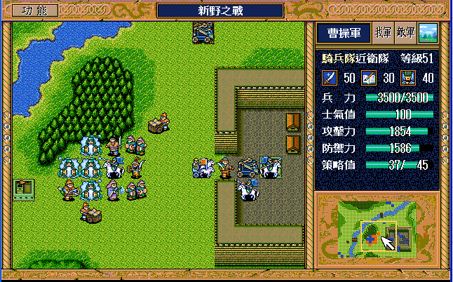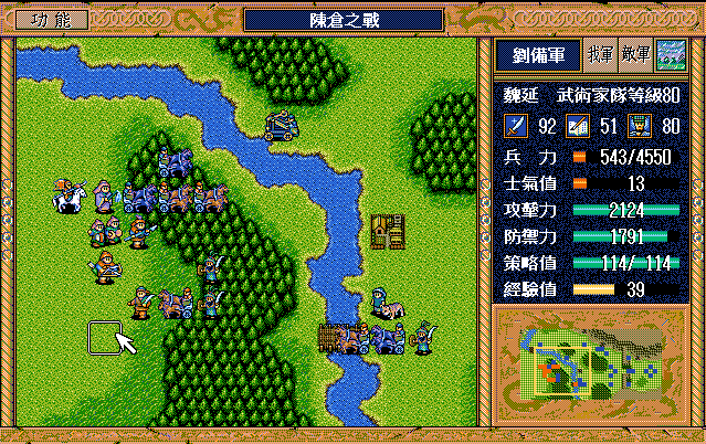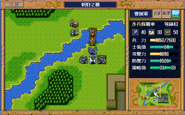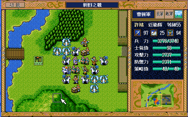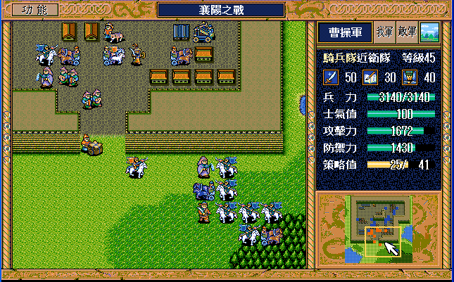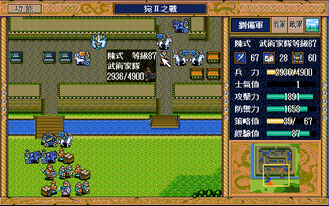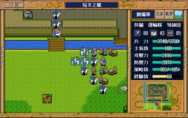 后面孔明伪装混乱梅花五,开始放火,刘备帮忙成阵后吸引两个步兵下来,其中一个混乱备用,然后出发拿青囊书给吴兰,吴兰第18回合变运输队,由于敌军ai太讨厌,没有刘备配合敌军会乱走,敌军体力根本反击不完.注意保留激励点,第34回合刘备出发,第37回合灭曹仁左下一个步兵,吴兰灭步兵给关羽开路,关羽出发去单挑曹仁