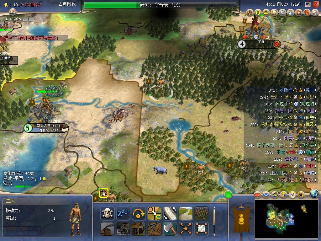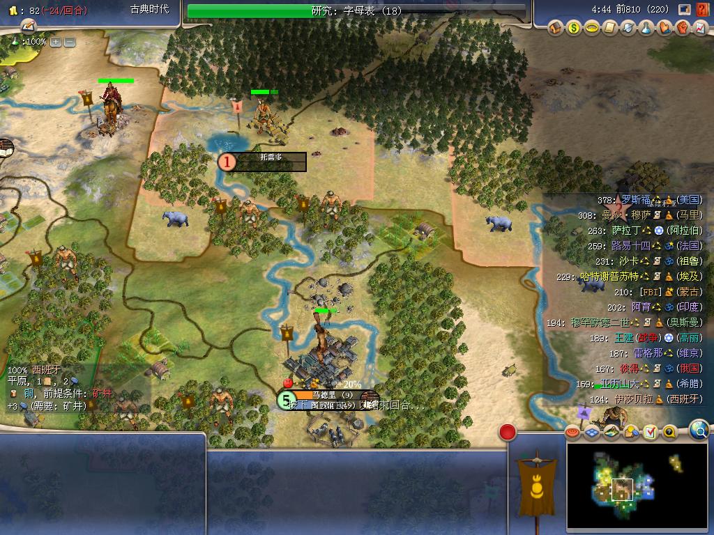 顺便说一下,埃及MM(黄色)已经在我北边沙漠地区放了3座城市(地图上能看出来),正好在我和老萨(最北的淡绿色)之间,在后来起到很关键的作用