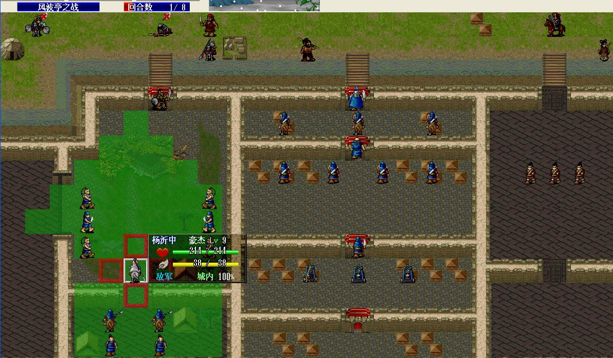 第6回合,张保已经将第二个武术家反击到喘气,此时张保离开,换为李琴堵在鹿砦上方的桥上,此时敌军先行动的不是杨沂中,而是喘气的武术家,他会站在鹿砦上攻击李琴,但由于李琴攻击力低,主动攻击只打21的hp,所以反击一定不会把武术家击退,这样,武术家和李琴就可以建立一个平衡,杨沂中只能在旁边看着,直到结束;