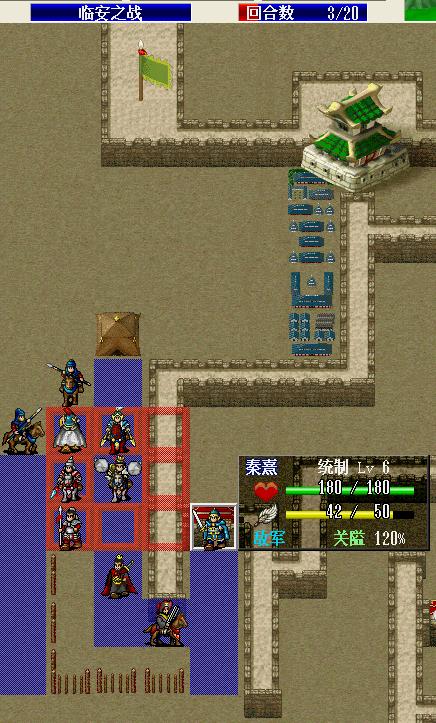此时再转到李琴处,由于岳飞触发了全军出击,中上部的敌军左移攻击李琴,虽然只有四个人可以打到她,但包括两个攻击力超高的御林军和武林高手,每人都能打掉李琴一半以上的血,因此,需要s/l李琴挡住御林军和武林高手其中的一个(一般能挡住御林军,只有小于70%的命中率),然后给残血的李琴吃经验果(共吃了两个);