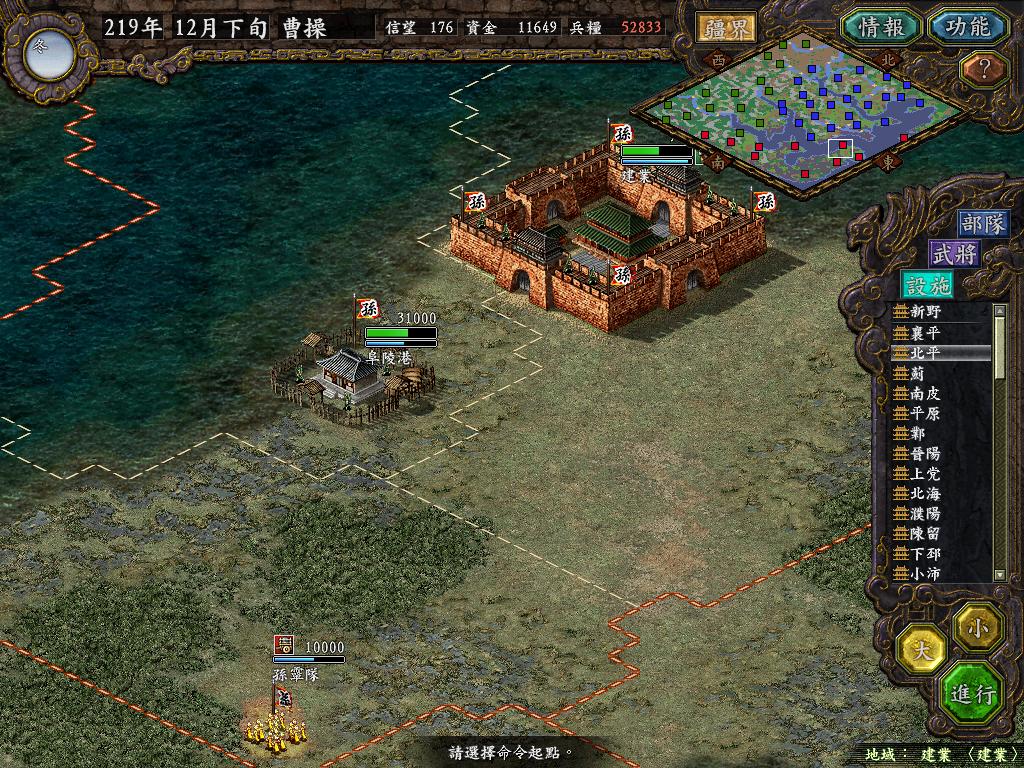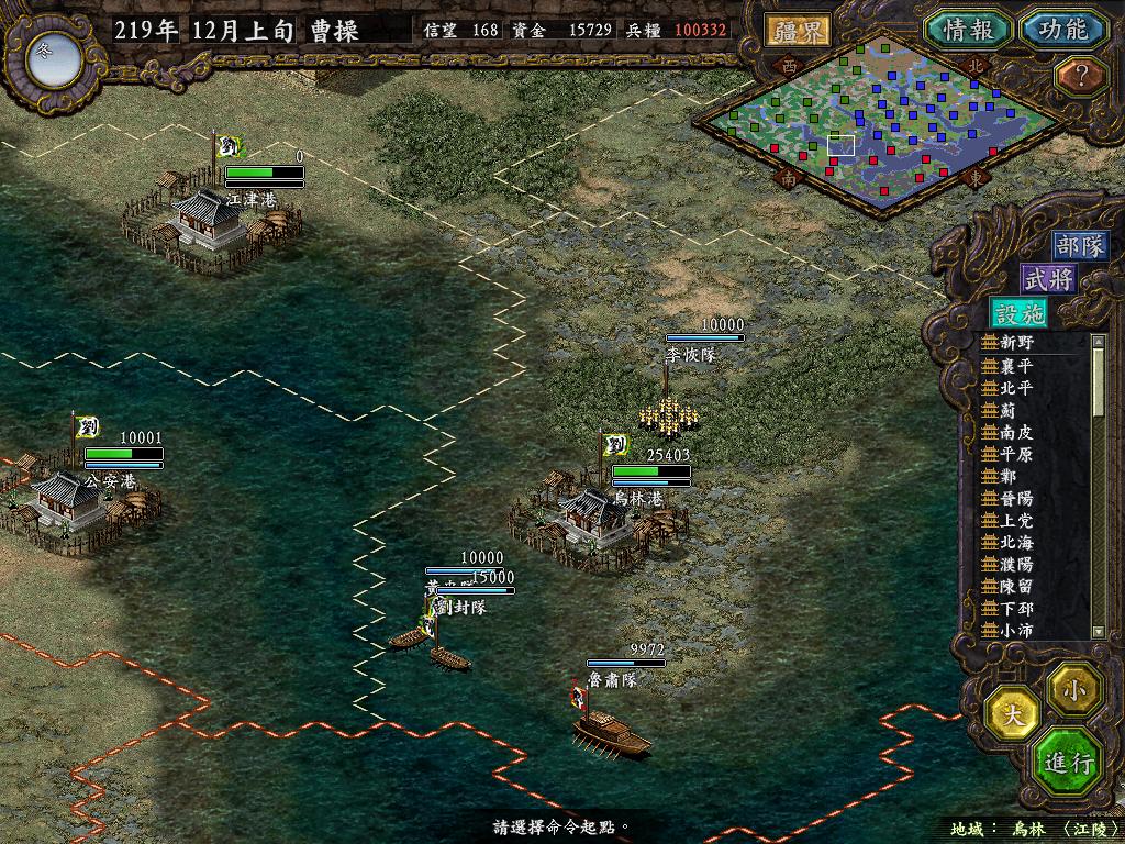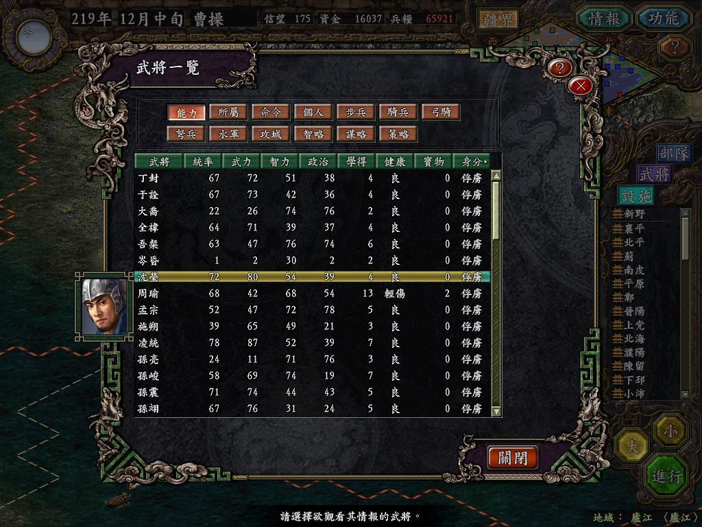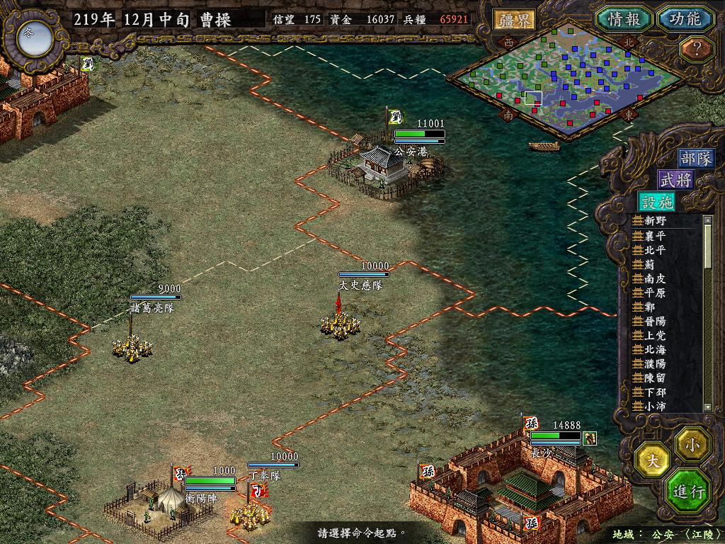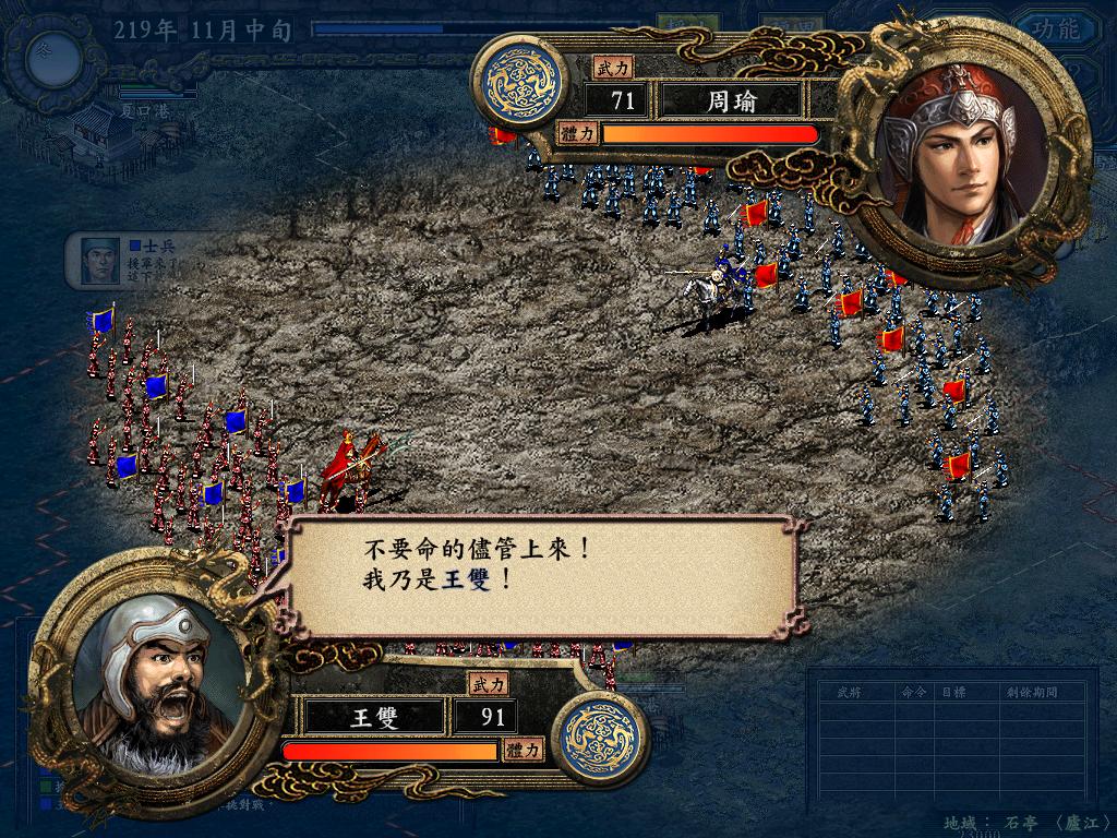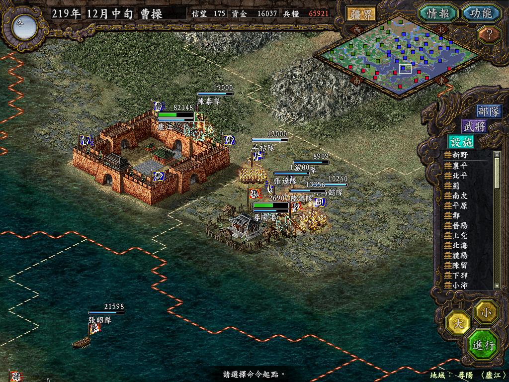 进行面:第二天曹彰就夺取寻阳,吴国各部除孙策由西门杀出,6W2皆呆于城内.夏侯霸部一马当先,发动连锁奔射,公谨损失1300人,剩余300兵马仓皇南逃,郭淮轻骑终于赶上,王双于阵中冲出,当下擒住公谨,三尖刀一闪,公谨重伤落马,徐盛见状,回马来救,拖回主帅,吴兵围上,策见状,大呼:公谨无恙呼!一个奋迅,杀的左翼的王睿人仰马翻.公谨只剩半口气,呻吟曰:既生瑜,何生双!夏侯部的夏侯惠见兄立大功,不甘示弱,文有文用,一个混乱定主公谨,吼道:复呻吟乎?自此瑜部全灭,徐盛为救公谨被俘.策的5000步兵也杀的只剩300人.