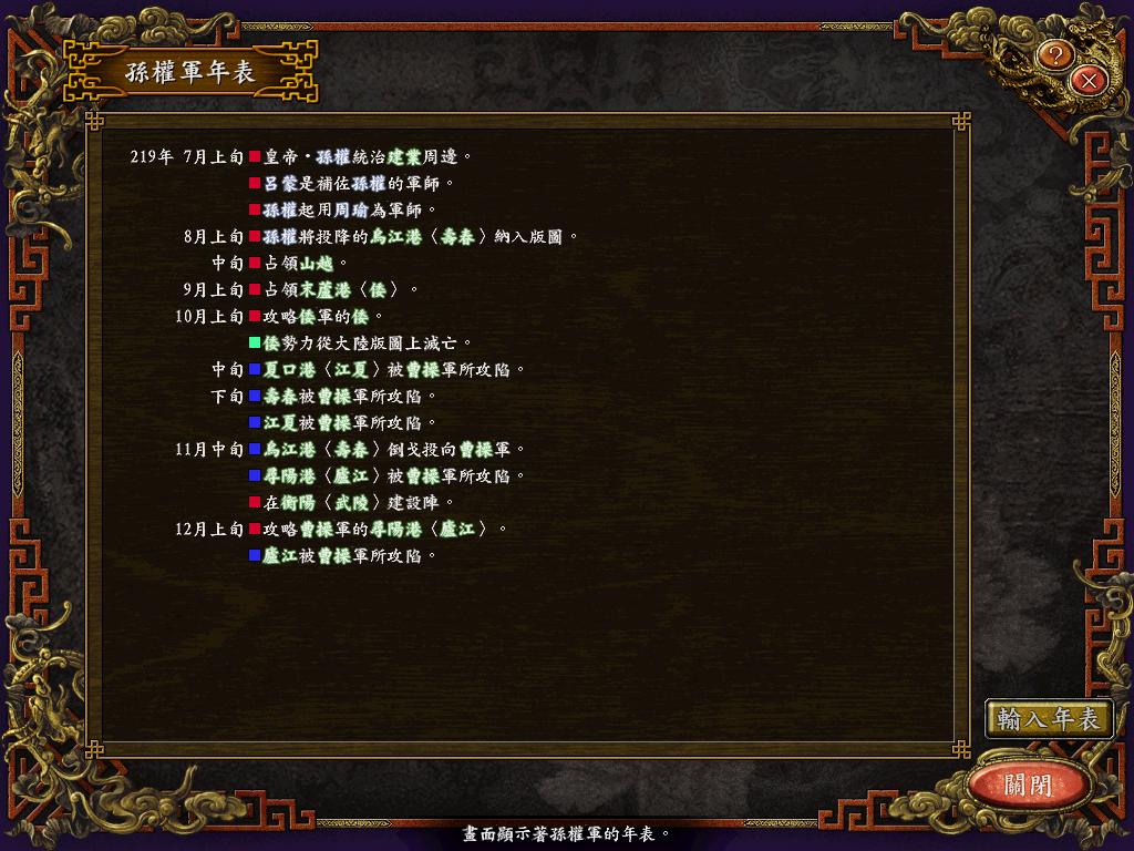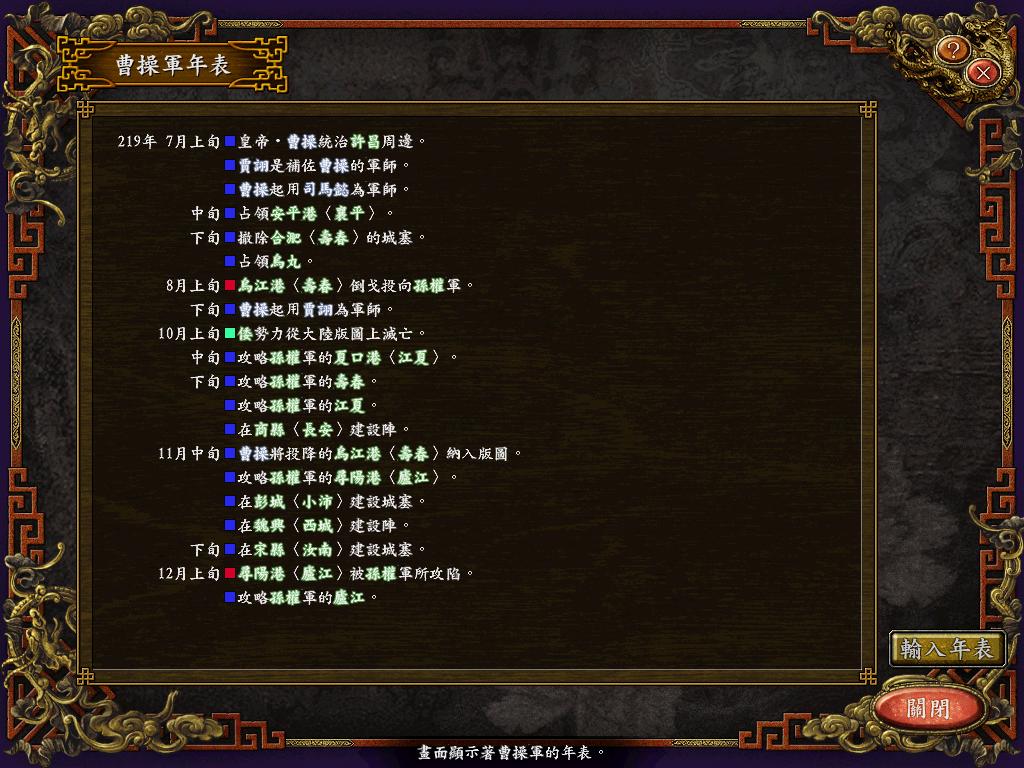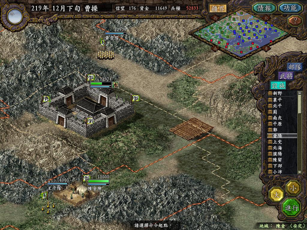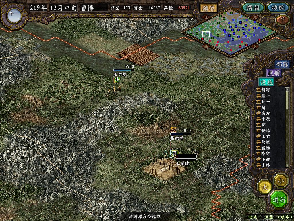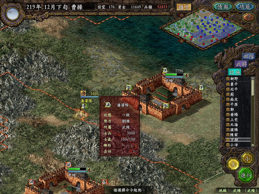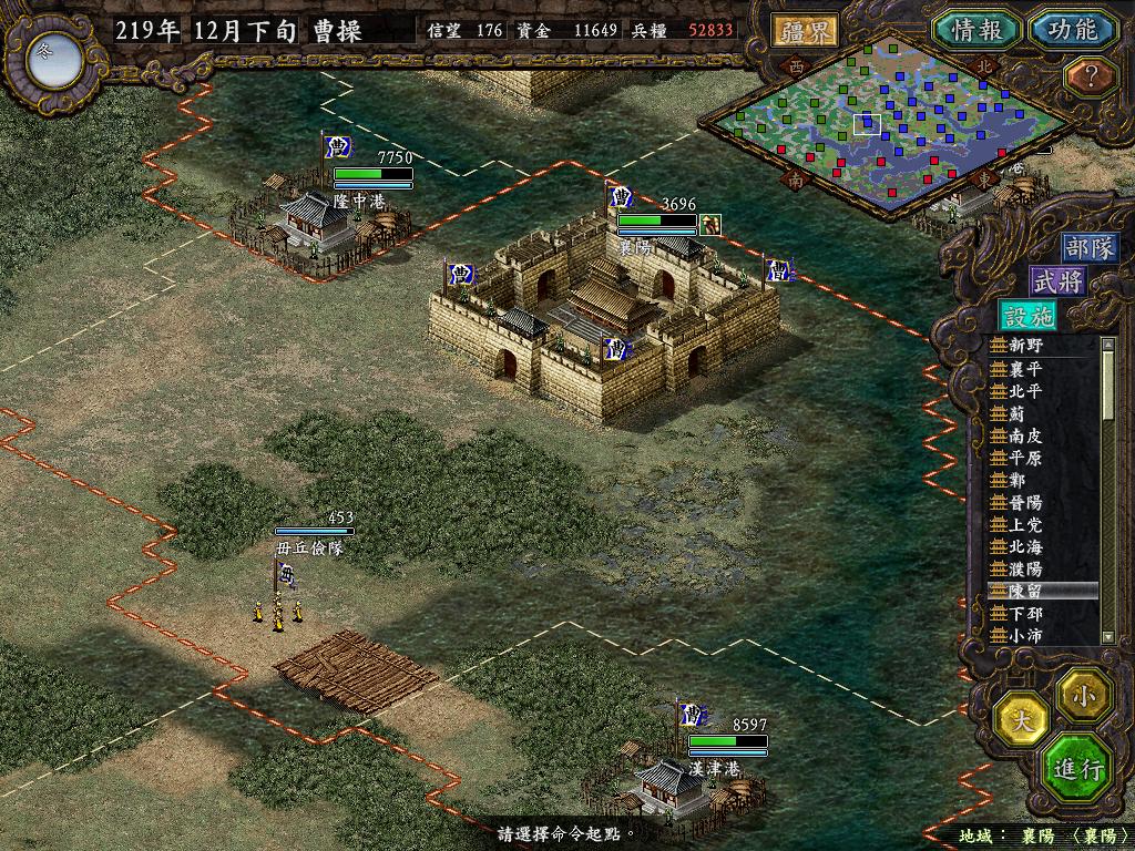 进行面:第二天曹彰就夺取寻阳,吴国各部除孙策由西门杀出,6W2皆呆于城内.夏侯霸部一马当先,发动连锁奔射,公谨损失1300人,剩余300兵马仓皇南逃,郭淮轻骑终于赶上,王双于阵中冲出,当下擒住公谨,三尖刀一闪,公谨重伤落马,徐盛见状,回马来救,拖回主帅,吴兵围上,策见状,大呼:公谨无恙呼!一个奋迅,杀的左翼的王睿人仰马翻.公谨只剩半口气,呻吟曰:既生瑜,何生双!夏侯部的夏侯惠见兄立大功,不甘示弱,文有文用,一个混乱定主公谨,吼道:复呻吟乎?自此瑜部全灭,徐盛为救公谨被俘.策的5000步兵也杀的只剩300人.