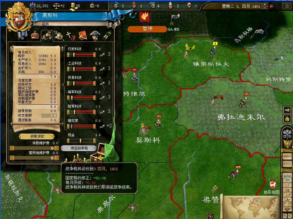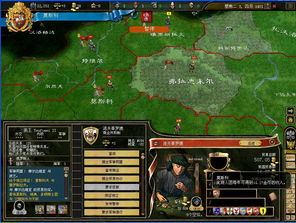 好消息传来,我们的商队终于在诺夫哥罗德立足,而帝国也有了6.49的贸易额.但是这还是远远不足的,更多的商队需要继续派出