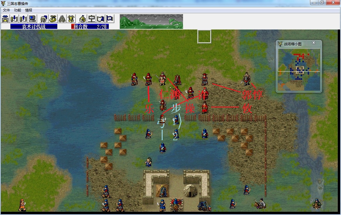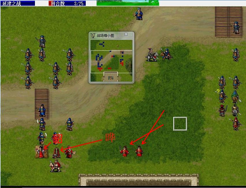 右边让关羽被击退(我第6回合行动前关羽就被击退了),然后杀上去。张辽吸引袁绍身边的两个步兵攻击,曹仁等人先除沮授(我是12回合除了沮授),然后慢慢消耗袁绍。16回合时曹仁杀到左翼,在确保刘晔的皮衣和另外几个lv2的布衣都练满的基础上,把所有敌军都杀掉。