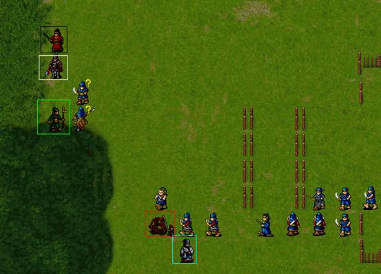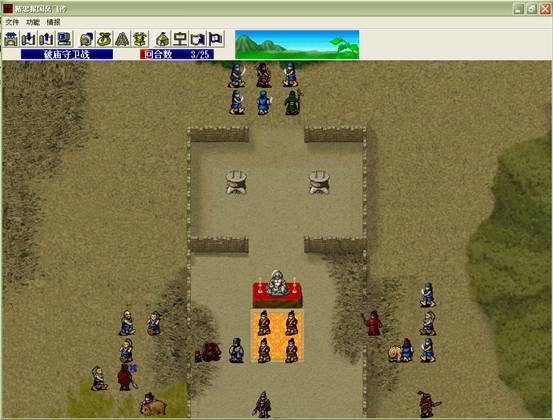下回合,汤怀触发乌国龙出击.王佐毒死骑兵,张显打道士,施全给王贵补血.(PS:王贵不要打死步兵,打至濒死即可!这样杨BT会走到吹死他!而不是去攻击文官)下回合変成这样.(12)