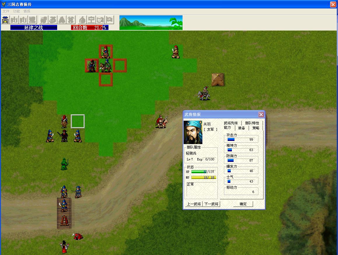 关羽继续助阵,有他在,确实简单不少。这关一共27个敌人,只有25回合,而且有好几个7级将领,就算关羽一回合解决一个也来不及,所以郭嘉也可以击退几个敌人。我选让粮草对诱敌,可以多引几个敌人过来并且都会混乱,关羽开始不会去单挑文丑,而是去打混乱的敌人,而文丑也会跑,所以先用几个人卡主文丑的位置,别让他跑回去。等关羽清完了小兵,他就会去单挑文丑了。而夏侯渊也任务艰巨,要过桥去引几个敌人过来给关羽打,不然关羽就没有利用好了,要保证他每回合都有敌人打才好。而另一边,刘烨堵住桥挨打,应该没什么难度,倒是郭图的毒烟很让人头疼,尽量别中,我是让貂蝉来解状态的。这关因为敌人多,所以回合很吃紧,要好好利用关羽,实在不行郭嘉就出手吧,三四个敌人的经验吃进也不打紧。25回合过关,郭嘉9.07级,其余人无经验。练出一个统帅果,敏捷果