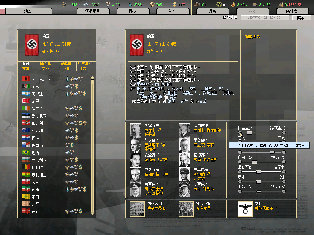 37.06.30又加了2点,不过没有关系了,这里法国的国策还是要SL一下的,法国现在还是24点好战开战,如果拉干涉,就是11点了,最好SL一下让他拉鹰派