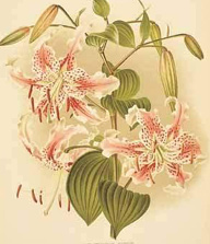 The magnificent Oriental Hybrid lilies we all love today, like Star Gazer and Casa Blanca, are recent descendants of two wild beauties with romantic names. One is the famous Golden-Rayed Lily, and the other is this one, Lilium speciosum, commonly called the Rose Red Lily of Japan, or more simply "Japan Lily". The botanical drawing shows the basic species, Lilium speciosum. The photo above is of the now-famous Rubrum variety.
