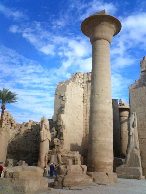 最让卡纳克名扬天下的,当然是阿蒙神庙的多柱式厅,共有16行134根巨石圆柱,其中有12根超过20米高,柱顶是纸莎草花式样。这些石柱历经3000多年居然无一倾倒,顶端内壁上记载着古埃及神话传说和当时人们日常生活的图形文字甚至连颜色也未褪去,确实令人叹为观止。石柱的底座占了大厅整体面积的一半以上,这种强烈的压力使人感到渺小和卑微,也许这就是人在神面前应有的感觉和态度罢。