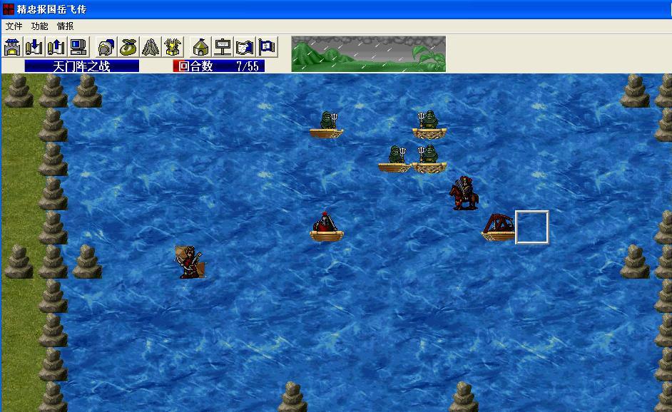 4.此关必须先占领朱雀阵的阵眼才能破其他阵,在此为朋友们准备了两种快速占领朱雀阵阵眼的打法。一种是我下面的贴图,1回合敌方行动时那笨阵主会移动开,王佐上去占领即可破除朱雀阵;另一种第1回合相同,但敌方行动回合时阵主未移动,2回合时将王佐往岳雷方向移动到阵主必须移动才能用策略打到的位置,然后三个文官进阵引发阵势效果,岳雷快速前冲,敌行动时阵主就会移动出来用策略打王佐;第3回合装备踏雪的岳雷正好可以移动到阵眼位置。用第一种方法可避免引发阵势效果,是上上之策。