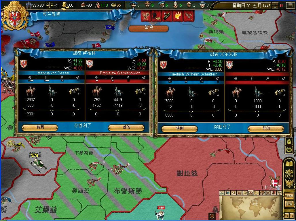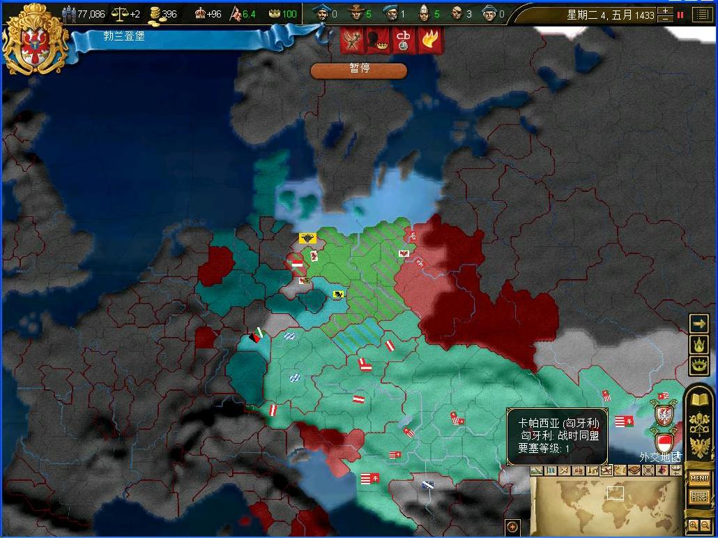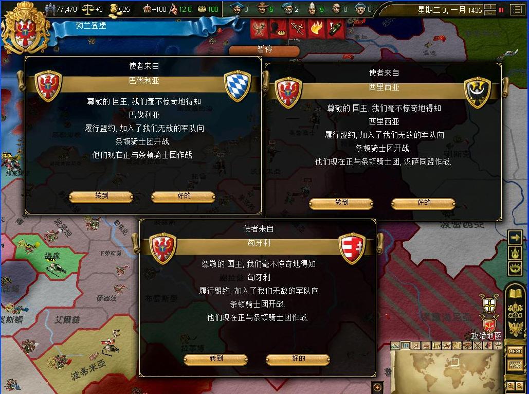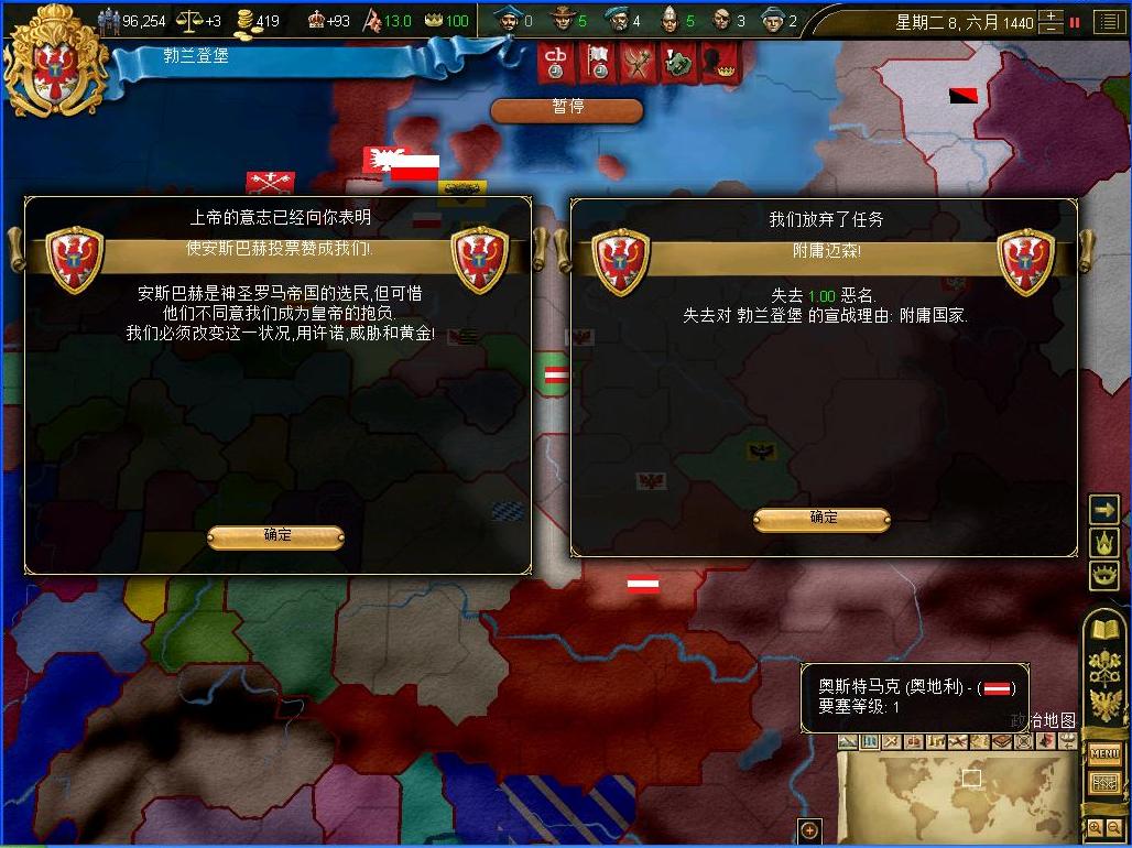 开战后观察了一下外交情况,还算不错,还有几个同盟和我一起作战,西线有两个敌国,都是小国,而且有一个隔着太多国家,没威胁.东西波兰是大敌,但是第一军有15k的兵马,而且大将领军,可以纠缠一段时间,只要西线完成任务,迅速吞并,回军东线,估计就没有大问题了.