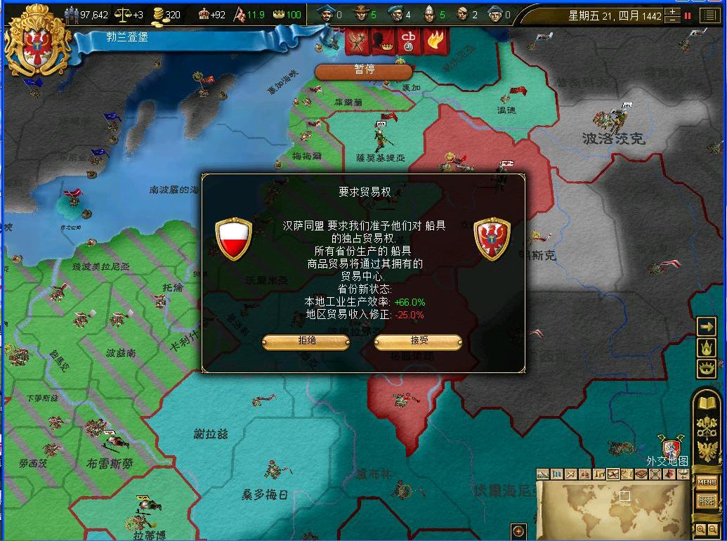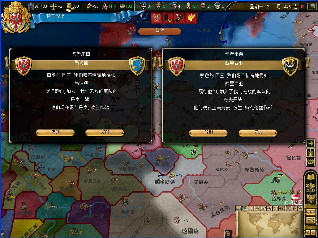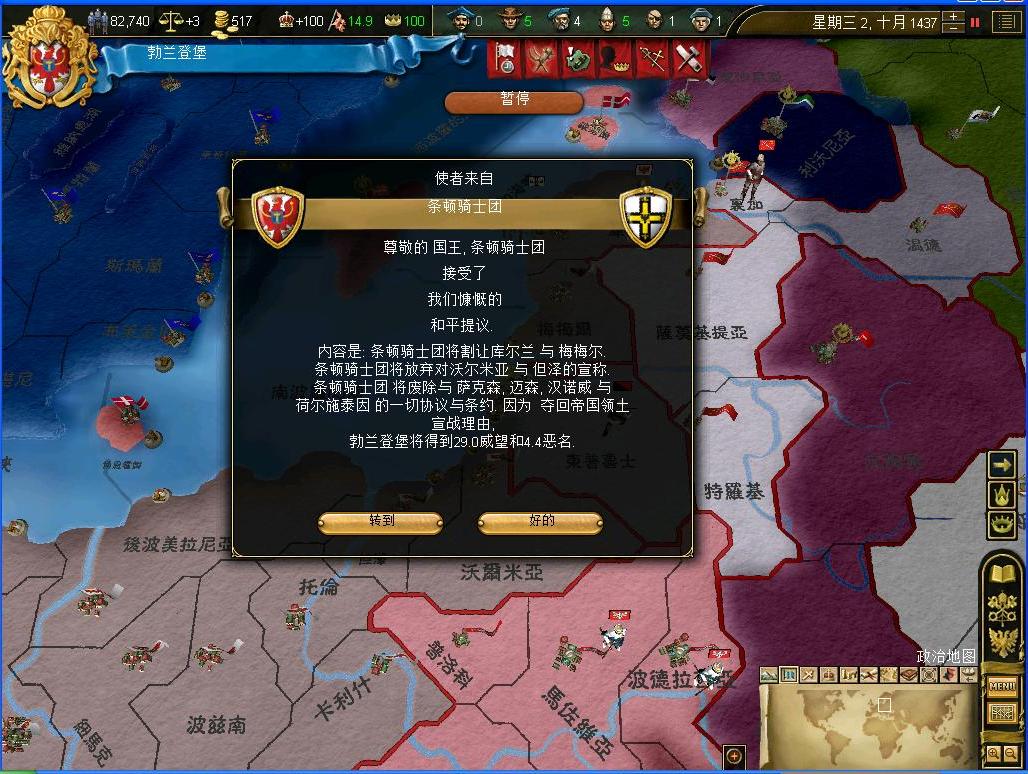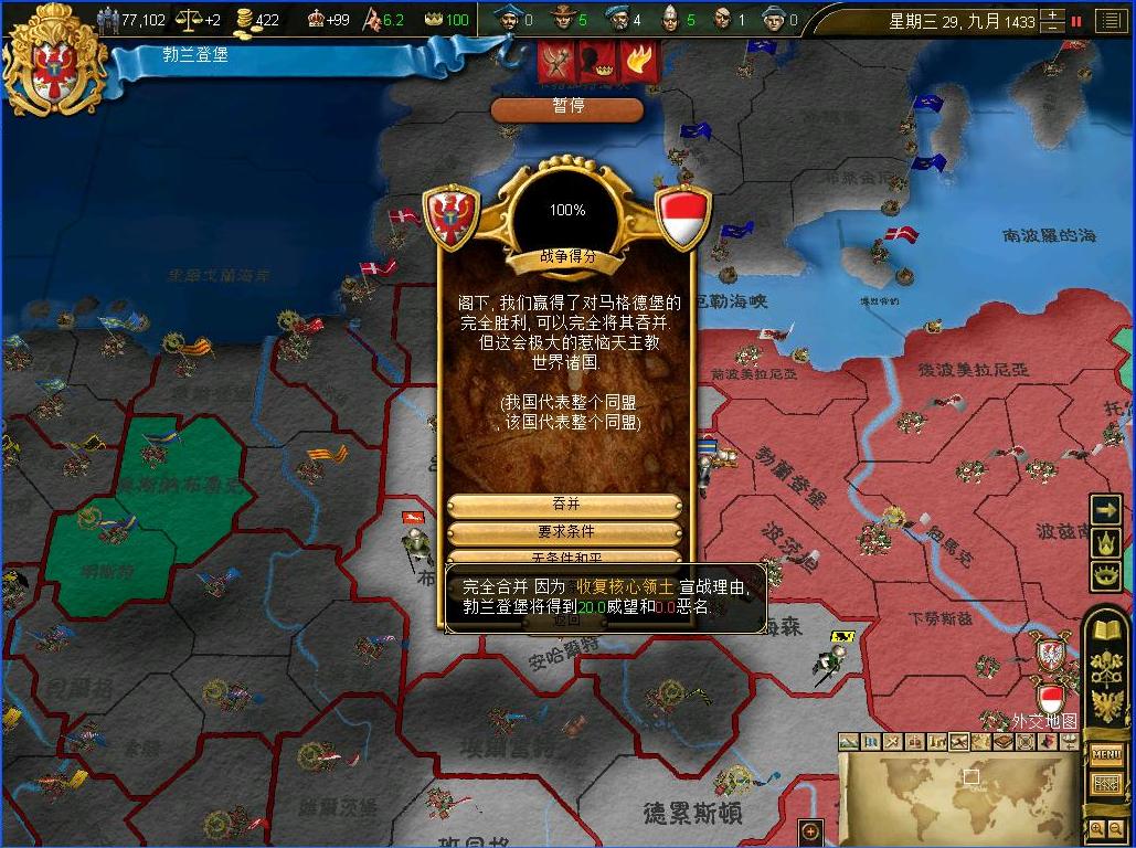 开战后观察了一下外交情况,还算不错,还有几个同盟和我一起作战,西线有两个敌国,都是小国,而且有一个隔着太多国家,没威胁.东西波兰是大敌,但是第一军有15k的兵马,而且大将领军,可以纠缠一段时间,只要西线完成任务,迅速吞并,回军东线,估计就没有大问题了.