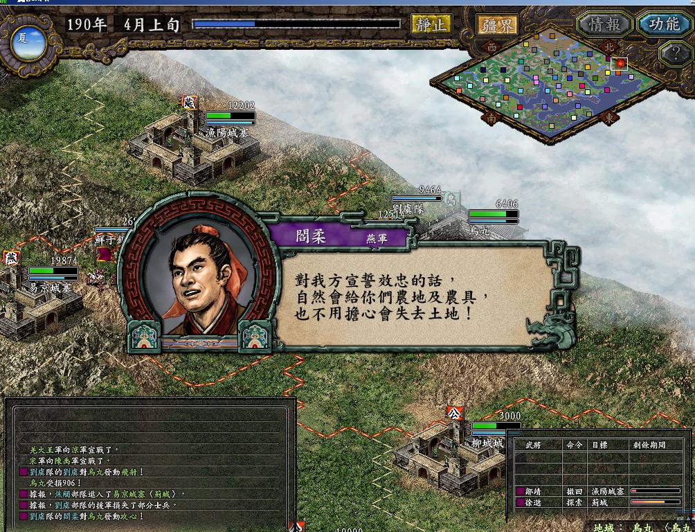 190年2月中旬,我军完成了进攻乌丸钱的兵力布局,刘虞亲自率中军6万1千人驻扎渔阳,鲜于银等四名骑兵将领带领5万2千骑兵驻守易京。2月下旬,我军正式向乌丸宣战,打响了攻略乌丸的第一枪。为此我以田豫、单经、刘虞率领三队井栏队进攻乌丸,中继点设在鲜城,邹靖带队1万方圆阵5天后出发迎战对方攻打井栏队的部队,另外齐周、鲜于银、鲜于辅、焦触各自带一队骑兵包抄乌丸出城部队,力图野战剿灭对方,为我军接下来井栏队攻城消耗对方兵力。对方果然派出乌丸大王和乌丸武将两队试图攻击我井栏队,正好被我围歼。战斗中乌丸的单挑给我放造成了很多麻烦,其乌丸城发起的连弩也给我军造成很多伤亡。但兵力的优势还是让我军迅速取得了野战的胜利,先后歼灭了对方的乌丸大王队和乌丸武将队。野战的胜利也使得我井栏三队顺利在乌丸城下回合。4月中旬,我军攻克乌丸!