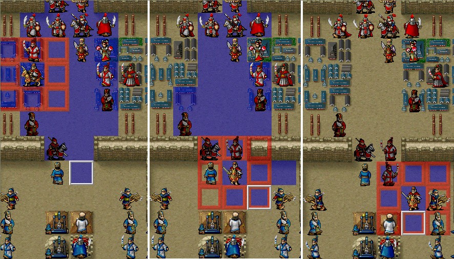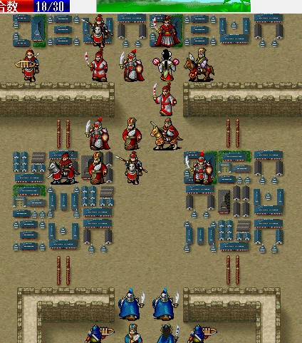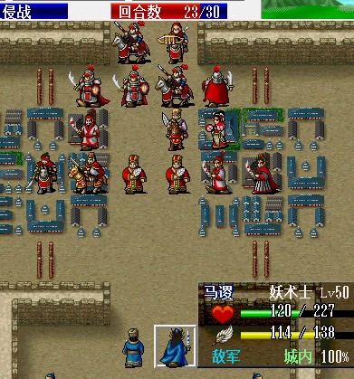 这关是一场十分辛苦的攻城战,一步一步慢慢来。先灭掉门口的一个步兵,派人进城触发第一波伏兵。到我军行动时,军师先烧过,然后司马懿变天下雨,下回合司马懿变天晴天,军师烧完后,仙术士回归司马懿再变天下雨,如此做法虽略显无耻但十分有效。后面没事做的人补水补米。
