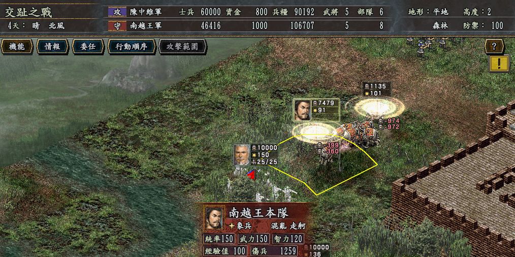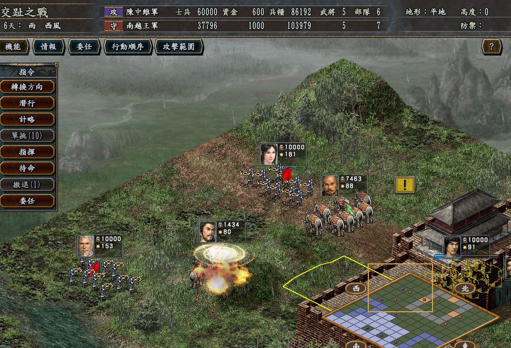 就在我军兵力达6W,准备出兵一举击溃南越时,薛国向我军赠送资金1000,关系变成良好了。。。我还纳闷,薛国为什么送资金给我?于是问宝贝,她说:“有可能他想打楚国,想跟我国搞好关系,说不定到时候会叫我国助他一臂之力。如果真是这样的话,那近期他还会继续送资金来,然后跟我国同盟,助他攻楚。”我说:“原来如此,那我们有6W军力了,可以出兵灭南越了吧。”她说:“神,稍安勿躁,我们埋伏在交趾的勇士被捕了,听说已经慷慨就义,我已派吕尚再去刺探军情,再过几天就可以回来,到时候我们出兵一举灭掉南越!”我不禁叹道;“又损失了一位英才,南越王,你真残暴!我一定要尽快解救处在水深火热中的交趾人民,统一交州。”