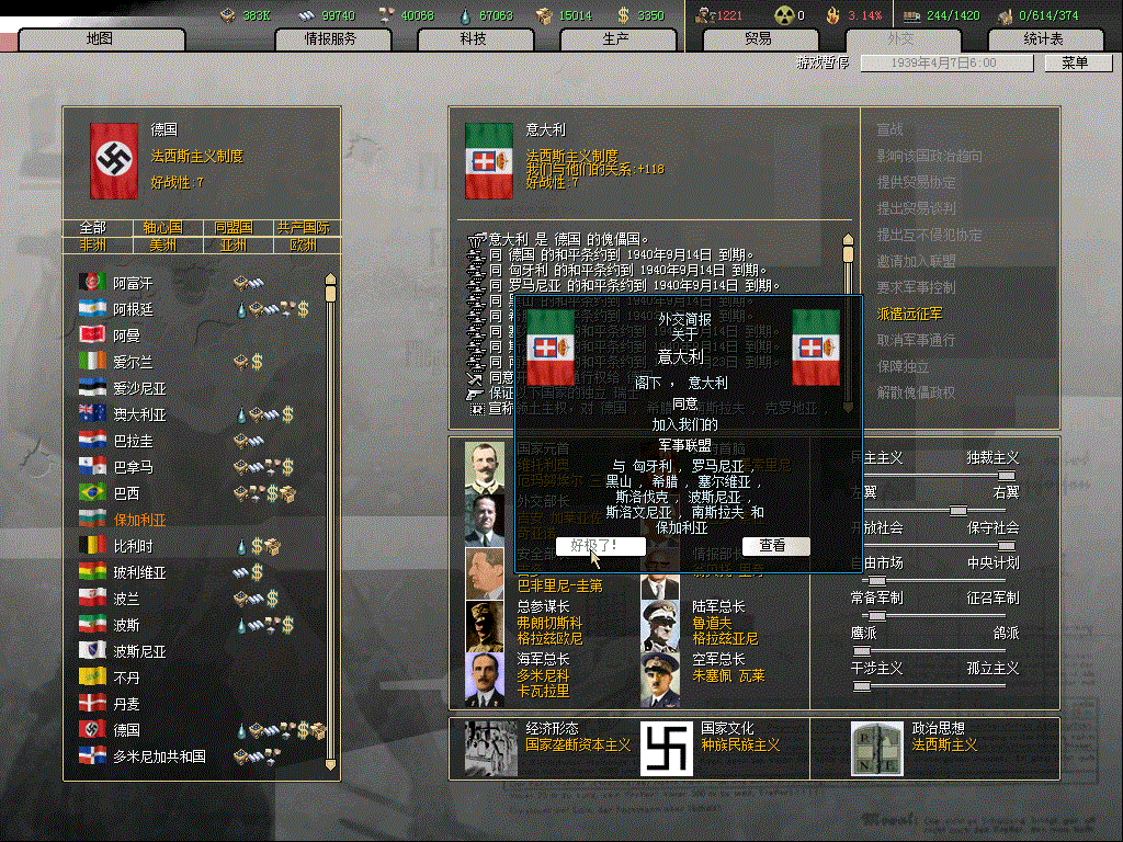 提前结盟后的意大利惨不忍睹,就算是玩家也挡不住法国,因为法国会和德国静坐,主力来推面条