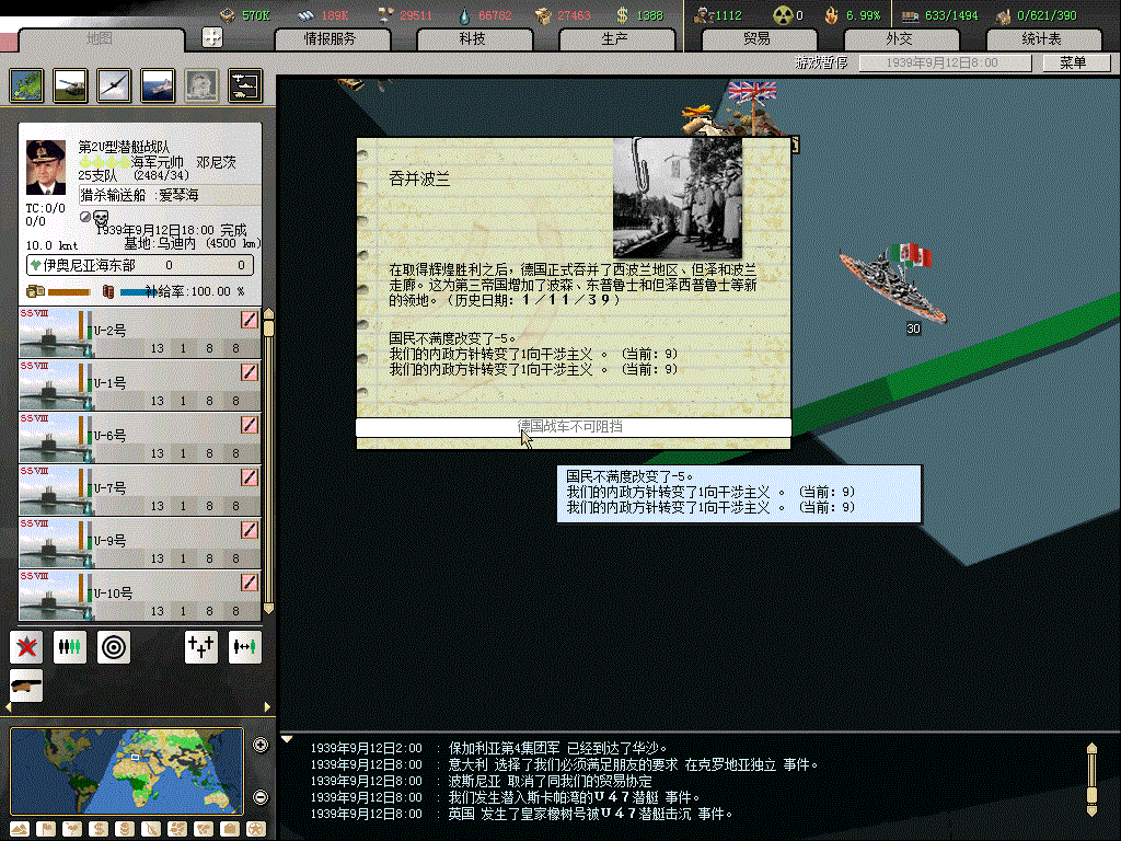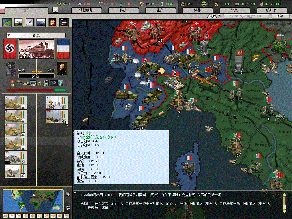 39.09.27伞兵空降加运输舰速度抢占北非,打通苏伊士运河,运输舰被英国两个小驱逐舰骚扰,损失惨重,看来鱼雷还是要配的。伞兵可以直接从 塔兰托飞到中东,都不用先打希腊的,太强大了