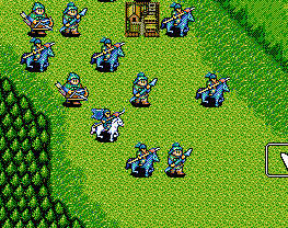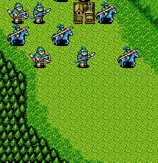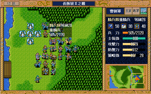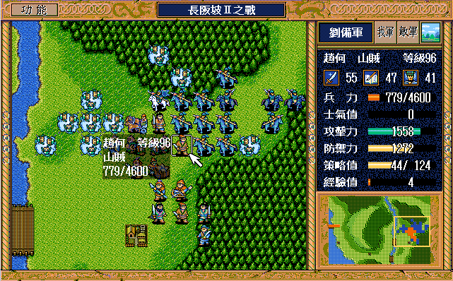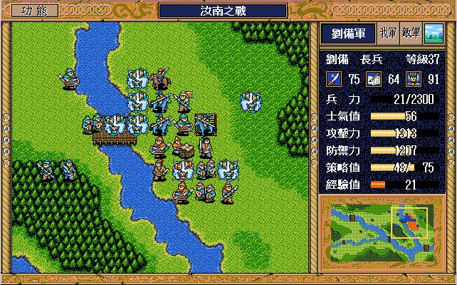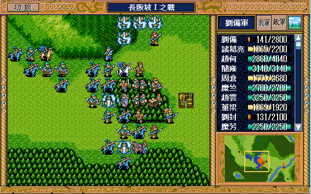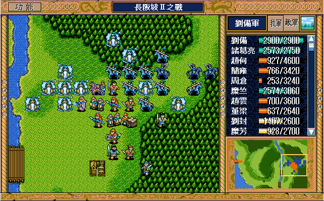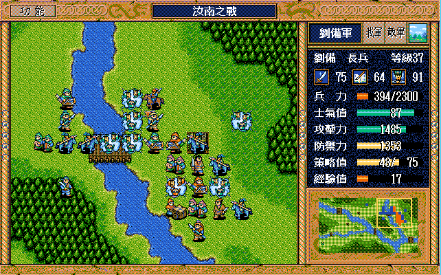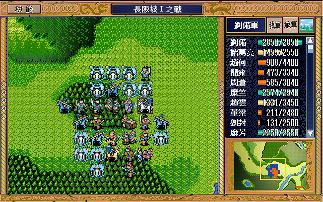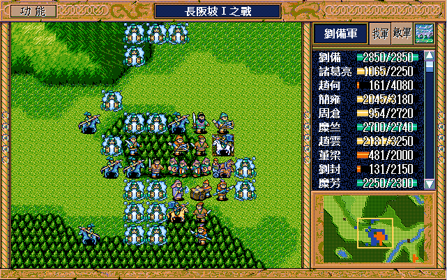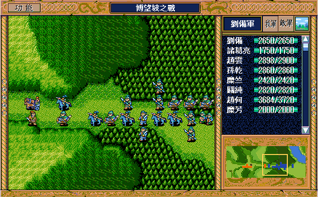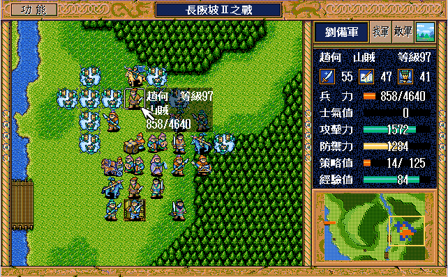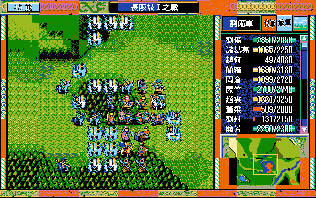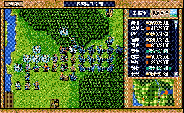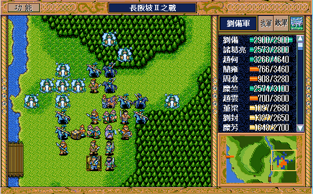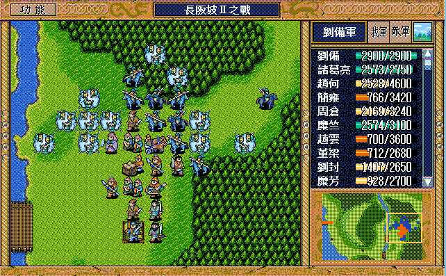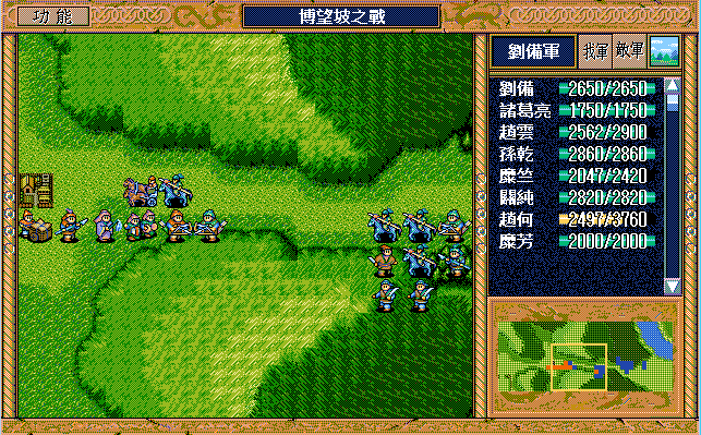 敌 李典左下攻击赵何(明显攻击糜竺或董梁的行动价值更高,却只攻击赵何,可能和刘备的位置有关),夏侯惇左攻击董梁(反击),夏侯渊左攻击赵何,张郃左攻击简雍,曹洪左援助夏侯渊,贼兵3左上攻击诸葛亮(明明在原地山上就可以攻击,非要左移一格,而且刘备和他还紧挨着,真不失漂移本色)。