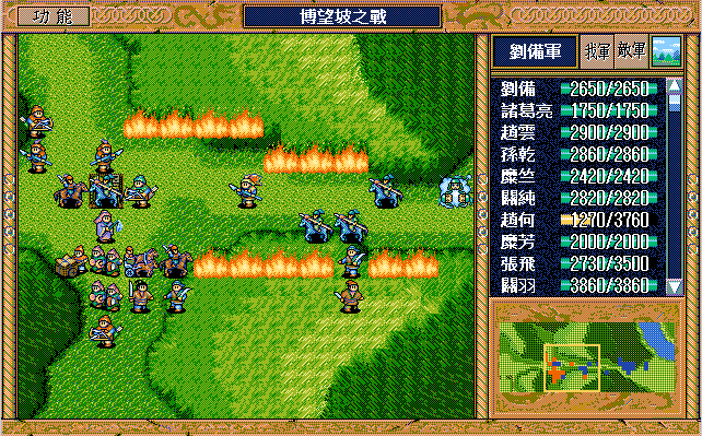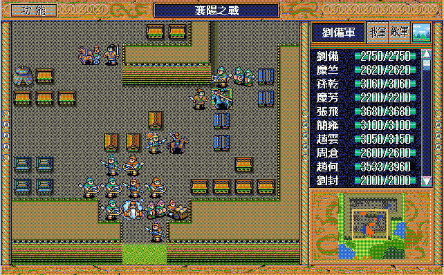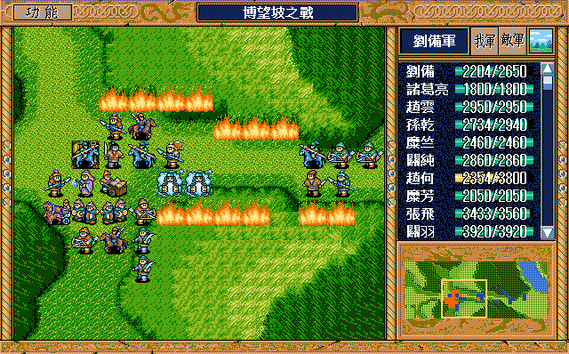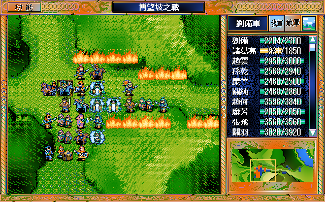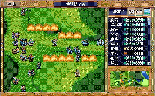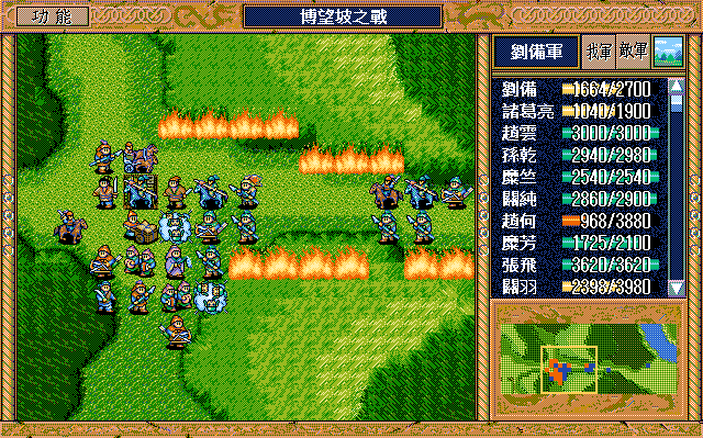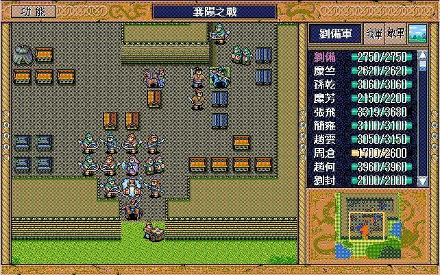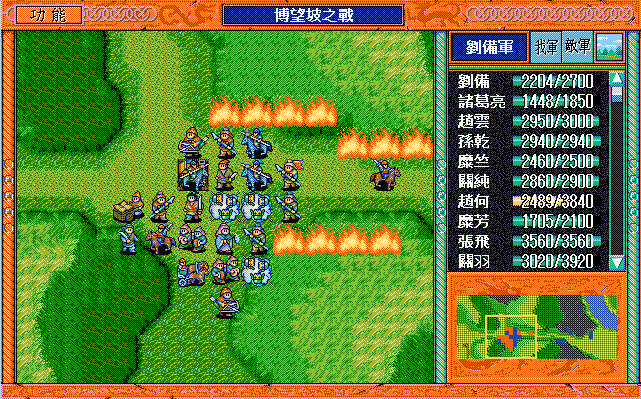 敌 夏侯惇开始左攻击赵何,夏侯渊上攻击刘备,夏侯杰左上上猛火(失败)、马延右上攻击周仓(开始反击),焦触左上浊流、曹洪左攻击刘备,文聘左攻击诸葛亮,骑兵1下攻击、骑兵3左方两格或左下挑拨刘备,骑兵4左方两格挑拨赵何(变傻瓜),骑兵5左方两格挑拨刘封,骑兵6左方两格挑拨诸葛亮(失败)。