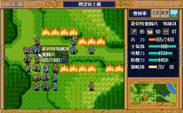 董梁:策略24回合192点,焦热书3次34点,攻击41次曹操600点(16X28+14X4+12X4+10X4+8X1),等级超过曹操前反击曹操55次708点(16X29+14X4+12X4+10X5+8X6+6X7),反击夏侯惇1次12点,正常反击10+3次62点(40+22),吃人1个7点,过关50点,共1665点(行动69回合);