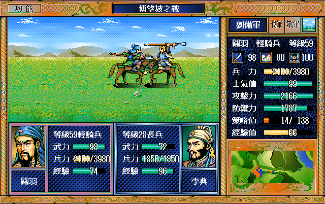 敌 李典下援助张郃(升级),夏侯惇左攻击糜芳,夏侯渊下攻击刘备,焦触左方两格浊流糜芳(失败),曹洪左下援助张郃,文聘左攻击赵何,骑兵1左方两格挑拨刘备(失败),骑兵3左方两格挑拨赵何,贼兵3左攻击董梁(不反击)。