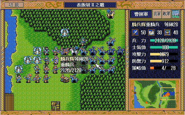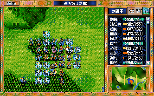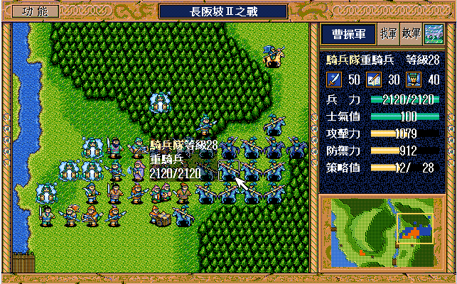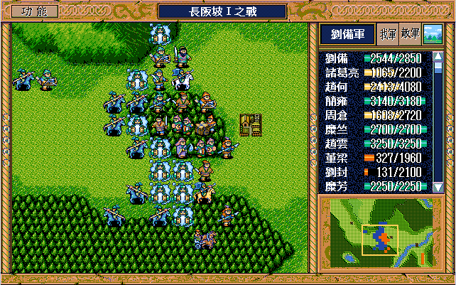 敌 夏侯渊左攻击刘封,乐进左攻击董梁(不反击),张辽左上火龙、夏侯杰左上上猛火周仓(都失败),焦触左方两格浊流刘封(兵力130左右,士气54,长坂坡II之前不再援助、激励他,一是方便长坂坡II开始时的就业,二是士气低了有利于后面群殴曹操),曹洪左方两格火龙董梁(失败),文聘左攻击周仓(三回合),骑兵3左下牵制(难,不用挑拨是为了留下他仅剩一次的策略机会,下回合牵制我方以提供军乐队就业)、骑兵5左方两格挑拨赵云,骑兵6左方两格挑拨周仓(二回合),弓兵1左下援助文聘(二回合)。