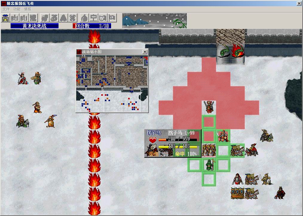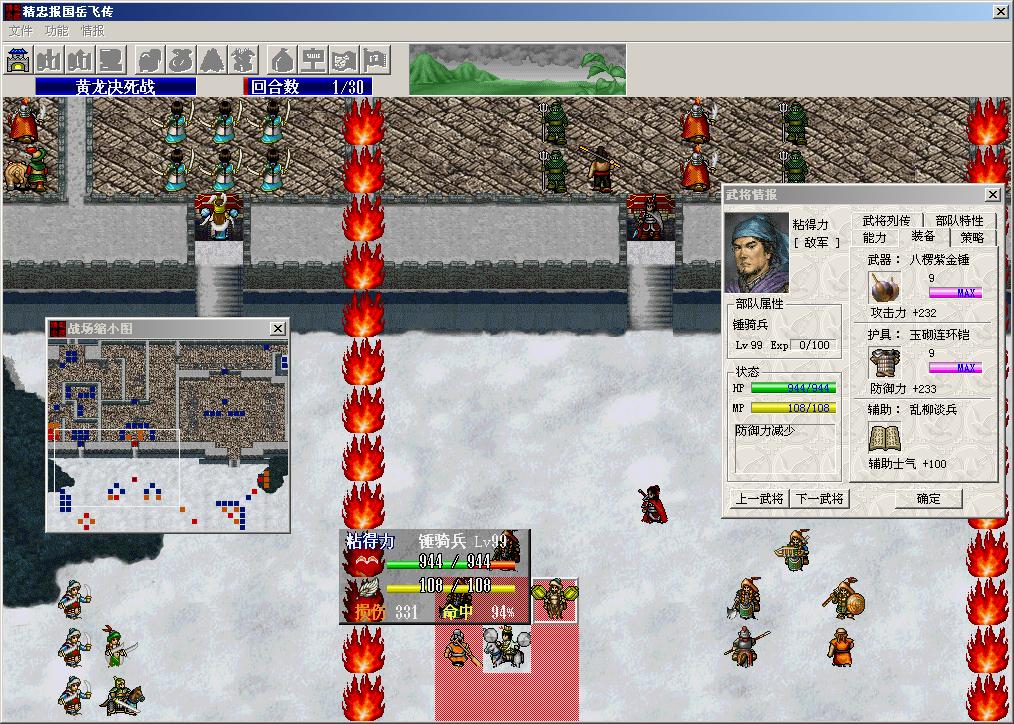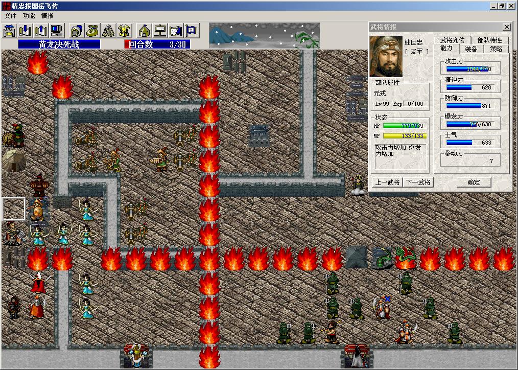 俺的方法是高宠单击(一定不能双击)5号拐子马,老牛吹它一下。伍尚志原地干啥都行(就是不要补血)。这样敌方回合王贵虽然会被反击一下,但是张显却会右移一格杀掉5号拐子马,从而挡住7号拐子马对王贵的攻击点。