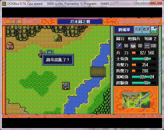 敌*宋宪开始和张飞缠斗(以下不述),弓兵1原地攻击关羽,弓兵上4休息,侯成原地攻击关羽