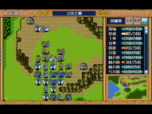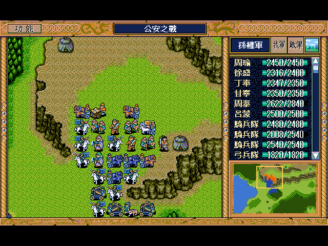 我   關純下2濁流騎兵3,董梁到關純下1,孫乾左1上2大策略,法正變軍樂,餘人全速上移到敵軍攻擊範圍外;調整大策略涉及人數 S/L 敵軍行動