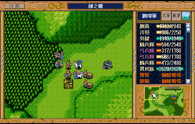 第9回合:吴兰下来变步兵,董梁到村庄上方援助自己,马谡率队跟上,伊籍到树林混乱骑兵,刘备援助刘辟,刘辟右移一格攻击混乱猛兽,赵云进树林攻击33级步兵,马良右2火龙书灭33级步兵,关纯注意卡位