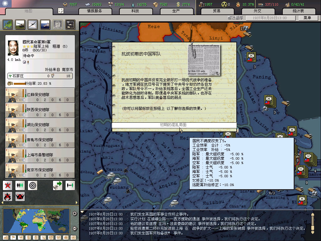 抗战初期的中国并没有完全做好打一场现代战争的准备 ,地方军阀在抗日号召下接受了中央号令却仍然各自为政,军队号令不一,补给系统落后,全国工业生产还未能转化为战时体制。即便是中央军系统的部队,也存在战术思想落后,军队装备落后的弱点