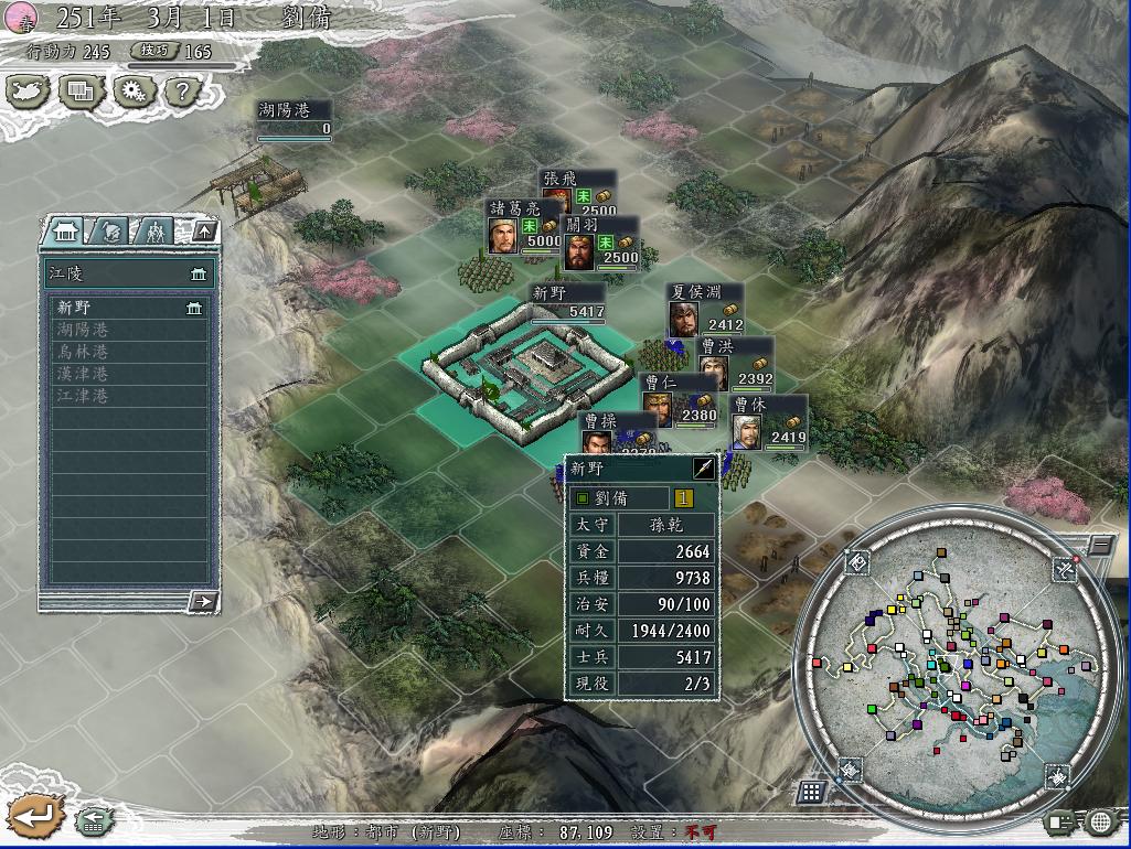 一到新野就造兵营也是针对你攻宛的部署,如果你 1 月 1 日倾城主力开往新野的话,我也可以从江陵派第二支运输队(许昌去宛和新野是两个不同的方向)。经测试,2 月 11 日江津运输队先于许昌运输队到新野(刘备、曹操开始都没有搬运或操舵)。曹操如果 1 月 1 日派攻击部队打新野的话,最早 2 月 21 日才能到达(但能攻击到新野城的部队只有两支)。真正大部队够得上攻击新野本城要到 3 月 1 日。但那个时候,刘备的第二批运输队也已经赶到,2 月 11 日从江陵飞往新野的将领们也赶到(看曹操出兵力度,刘备飞去的将领可以适当调整)。总之,曹操总攻之前,刘备第二批运输队可以驰援新野,刘备的晕人大军也可以开到曹操面前。