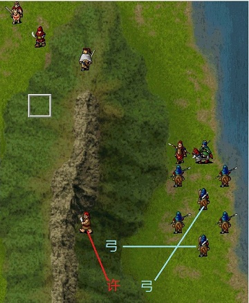 张郃在一开始的树木中挨简雍和一个步兵的打,这个在图外,看不到了;许褚吸引关羽队的1个弓骑在山上打,我本想吸引两个,不过有困难,算了;刘晔找个地方吸引2骑1弓骑上山,这样可以很快打满,而且敌人只有80%的能力;曹仁夏侯惇依次在水边,先是迎击关羽队,再迎击诸葛亮队,防具都升满了;其中还放过关羽队3个骑兵上山攻击于禁,这样于禁的铠甲也能升满,不过敌人实在太多了,于禁还是有几次反击,升到了4级,还好果子已经吃满,无所谓了。如此熬到最后,干掉刘备即可。当然因为敌军援军来的比较晚,除了刘晔和曹仁是新衣服以外,其他人都要穿旧衣服,才能练满。
