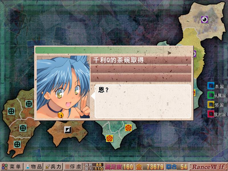 第二阶段比较麻烦,顺序宣天志,种子岛,明石。伊贺会剧情宣战,但不能灭,因为有葫芦,所以要默默的忍受他的爆菊吧。明石在灭了种子岛后必须立刻宣,否则会被毛利吞。明石需要触发三败,正好用战姬信赖的三败去抵消。在触发明石的剧情时,直接宣掉毛利,毛利的剧情有一大堆,只有触发完了,才能大决战。这时候是三线作战,因为是一周目,AI每回合最多反击1次,所以不难对付。明石有葫芦,灭不灭看喜好,一般来说大约在40多回合就可以灭了,次回合明石葫芦破。到目前为止,破3葫芦。
