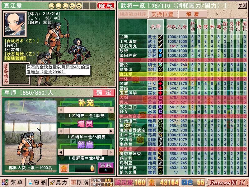 第三阶段,灭了明石,打下毛利的出云,就可以触发大决战了。大决战胜利后,可以捕获三妹抖,同时入手一块地域,注意一定要在灭毛利之前,抓住二姐,否则二姐无法信赖。现在就可以扔下毛利不管,50回合左右就可以宣死国,死国很好打,2-3回合搞定,顺手可以触发元就的诅咒剧情。然后立刻宣JJ,同时宣北条,不然北条不是被吞,就是剧情丢琦玉。这时候是4线作战,但依旧不是很难应付,北条那边防守反击,主打JJ这边,拿下MAZO后,打下佐渡一丸后等剧情后灭JJ。然后从琦玉方向开始进攻北条(江户那边是三高塔),陆续拿下琦玉和上总2000.早云禁止兰使用朱雀两次后,捕获兰,次回合早云失踪,北条元气大伤,劝诱兰,然后发展剧情,出现油田迷宫,打通,兰死,早云会在之后的剧情自动加入。然后搁置东线,转回西线,灭毛利,收三妹抖,砸友好度,触发4P剧情,父女四人一起出击,2周目就可以像我一样,直接追加三妹抖了。5葫芦破,进入本能寺之变。大约只需要70回合左右。