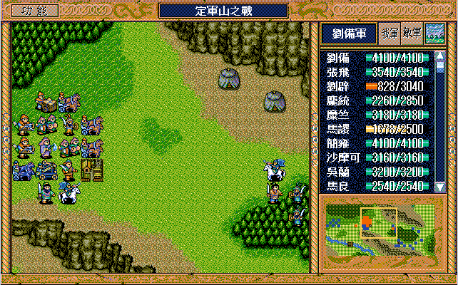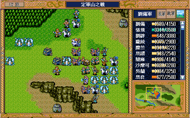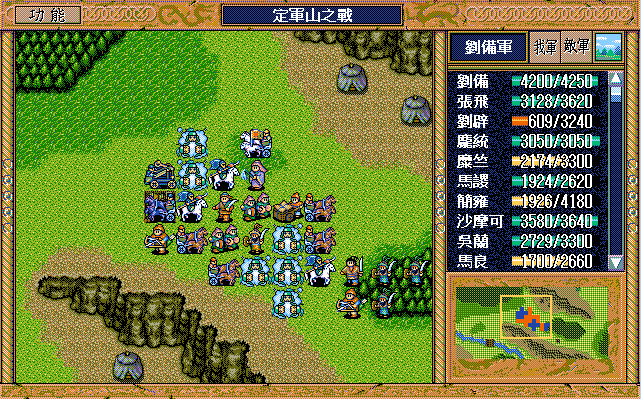 敌 弓兵1原地浊流(失败),夏侯渊右下激励异民族2(升级),夏侯尚右右下下攻击庞统,步兵1原地援助弓兵1(少,同样是为了防止他攻击马谡),步兵2原地攻击沙摩可(奇怪不用火龙,应该跟刘备有关),骑兵2右攻击魏延,骑兵4下攻击吴兰,异民族1右上攻击魏延,异民族3右下攻击吴兰,骑兵5上攻击魏延,骑兵6右攻击张飞,骑兵9左攻击刘备,弓兵2左方两格浊流简雍(失败,三回合)。