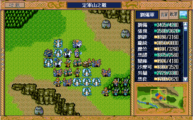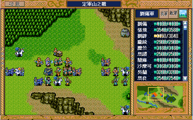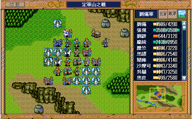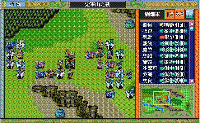 我 庞统下一,糜竺左上激励吴兰(从此不变位置),吴兰左下假情报、沙摩可左攻击骑兵7,刘封左上援助吴兰,马谡左上激励沙摩可(从此不变位置),糜芳左上假情报张郃,张飞下援助刘辟,简雍原地假情报徐晃,刘备左援助魏延,魏延左下焦热书骑兵3,刘辟左下援助魏延,马良左下援助刘辟,王平上攻击消灭骑兵1;