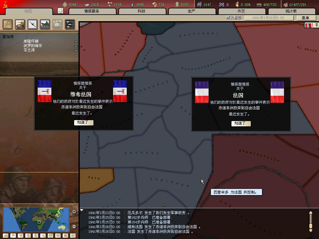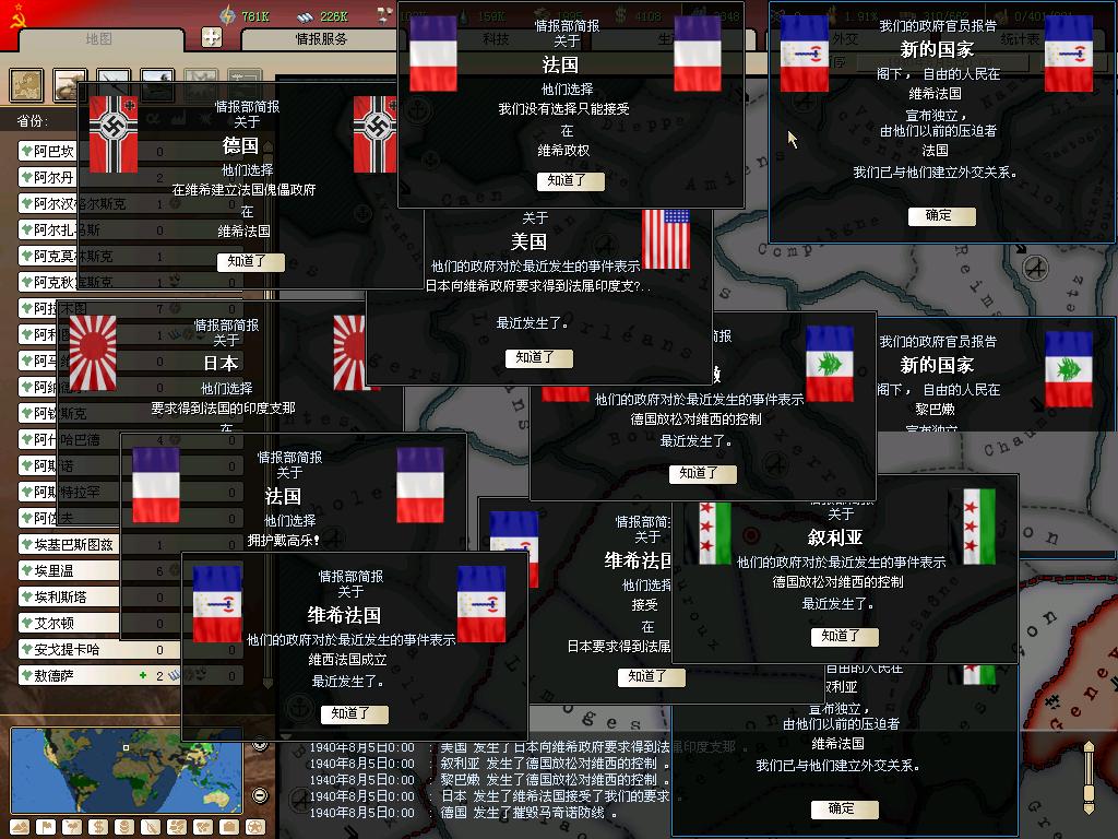 希特勒从博物馆里拉出那节福煦元帅羞辱德国人的车厢,在32年后羞辱了法国人。贝当和赖伐尔为首的法国投降派甘当傀儡,退出了战争。戴高乐将军出逃英国,发表了《告法兰西人民书》,号召法国人民继续抗战,不过他们目前只能依靠中非的原住民为光荣的三色旗抗战了。