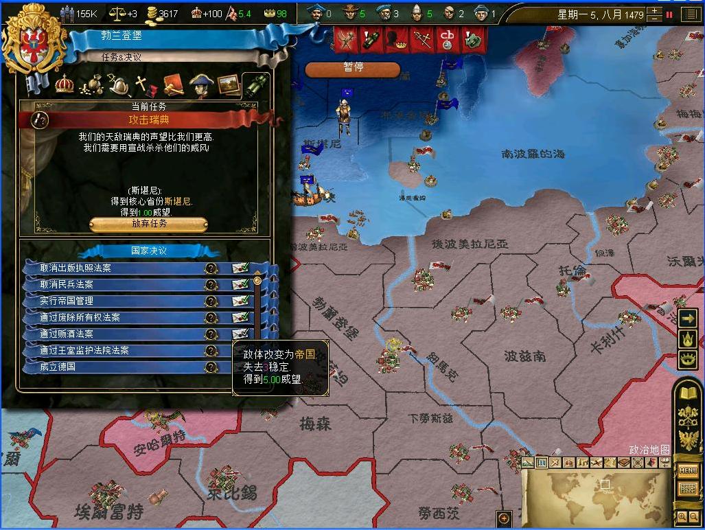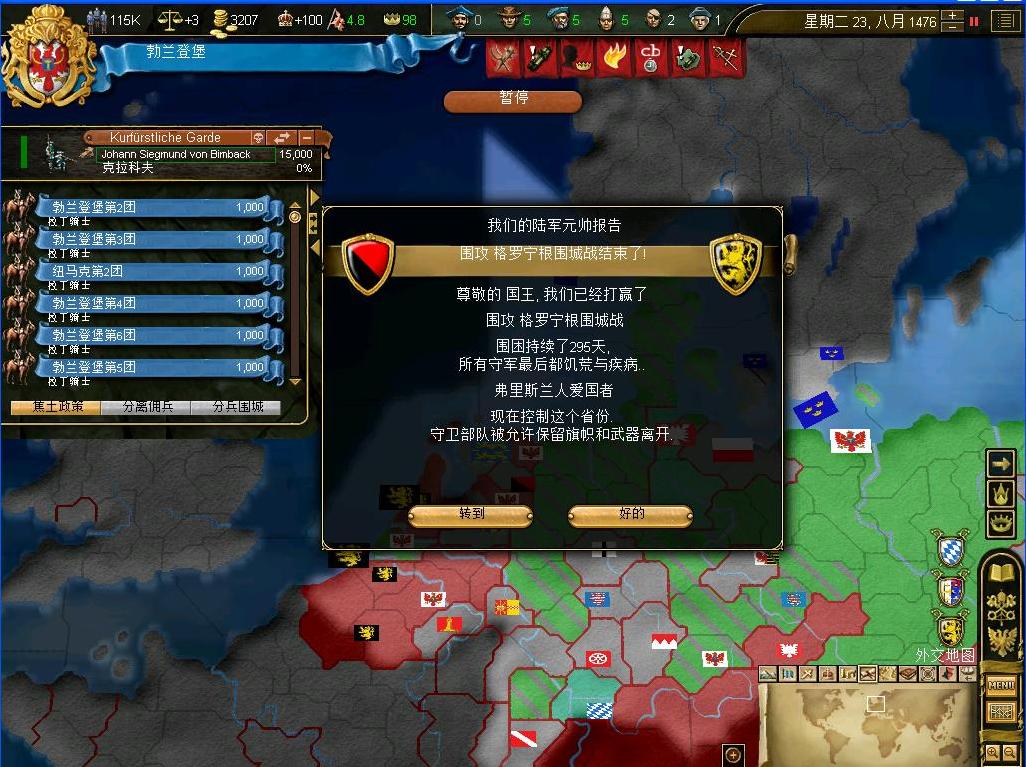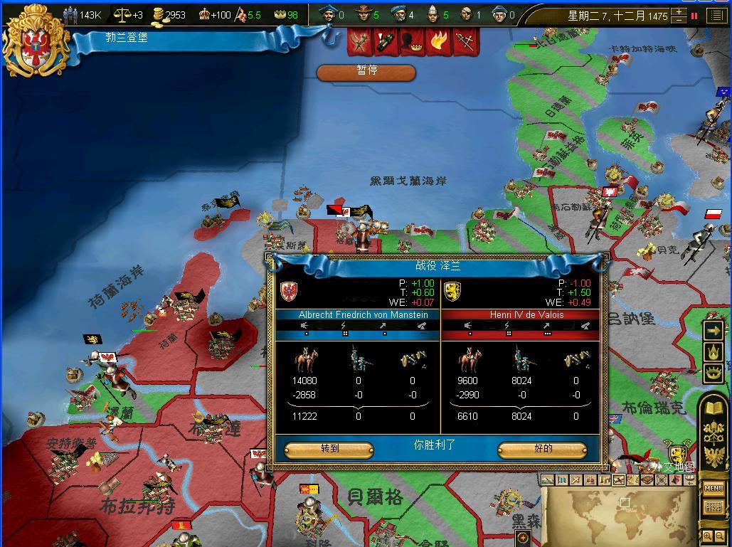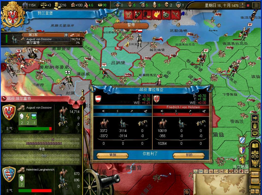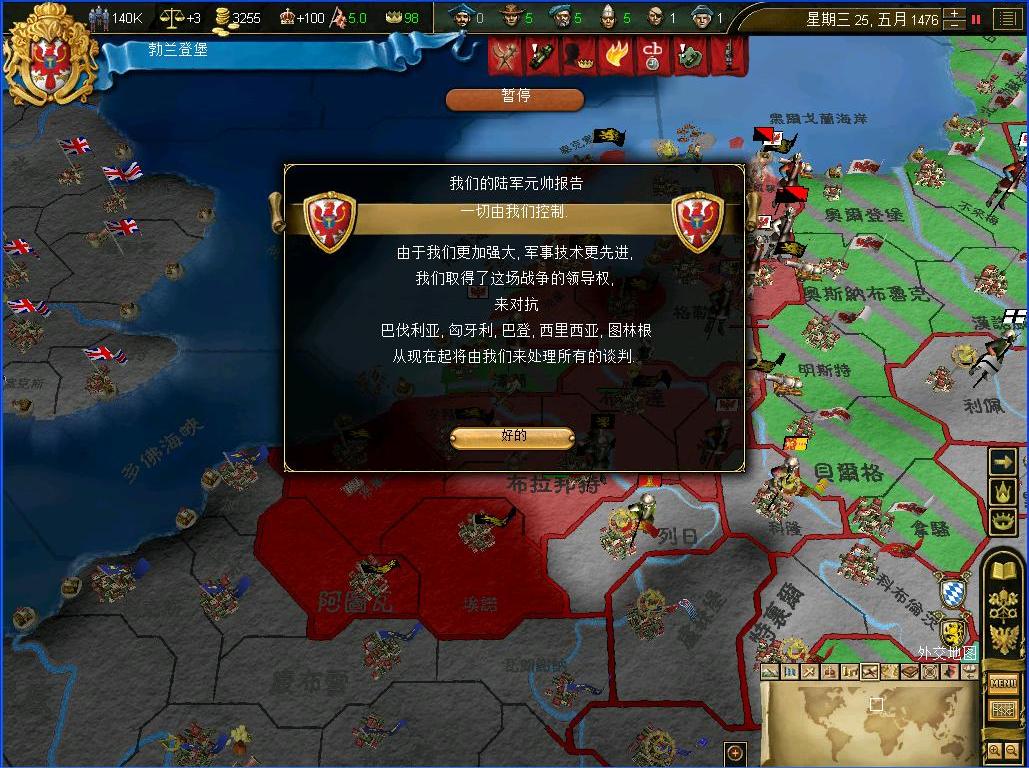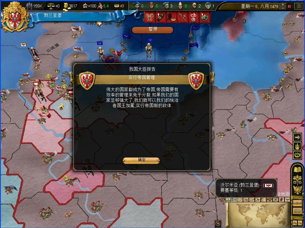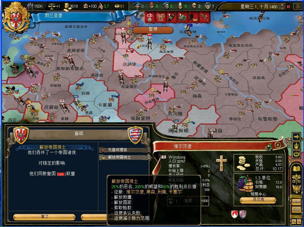经过了一年多的调整,帝国也从一开始帝国刚刚成立的不稳定期渐渐稳定了下来,而帝国的大军也一定程度上扩军并整编....接下来就是需要继续远征了,这次的目标是卷土重来的黑森公国,原本我们已经把他们打到只有2个省份了,现在居然又有5个了...这个苗头不好,抓紧趁着有理由,宣战之...