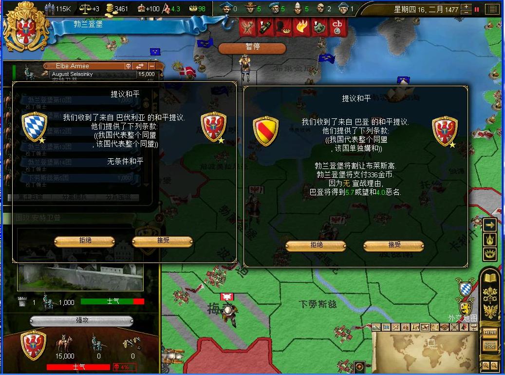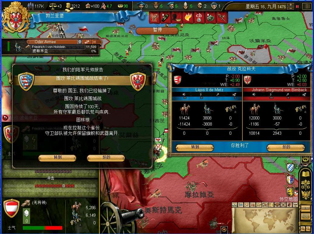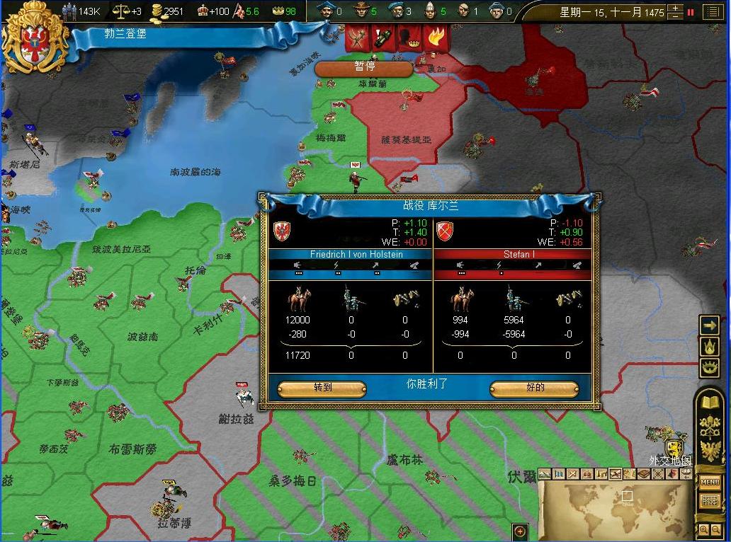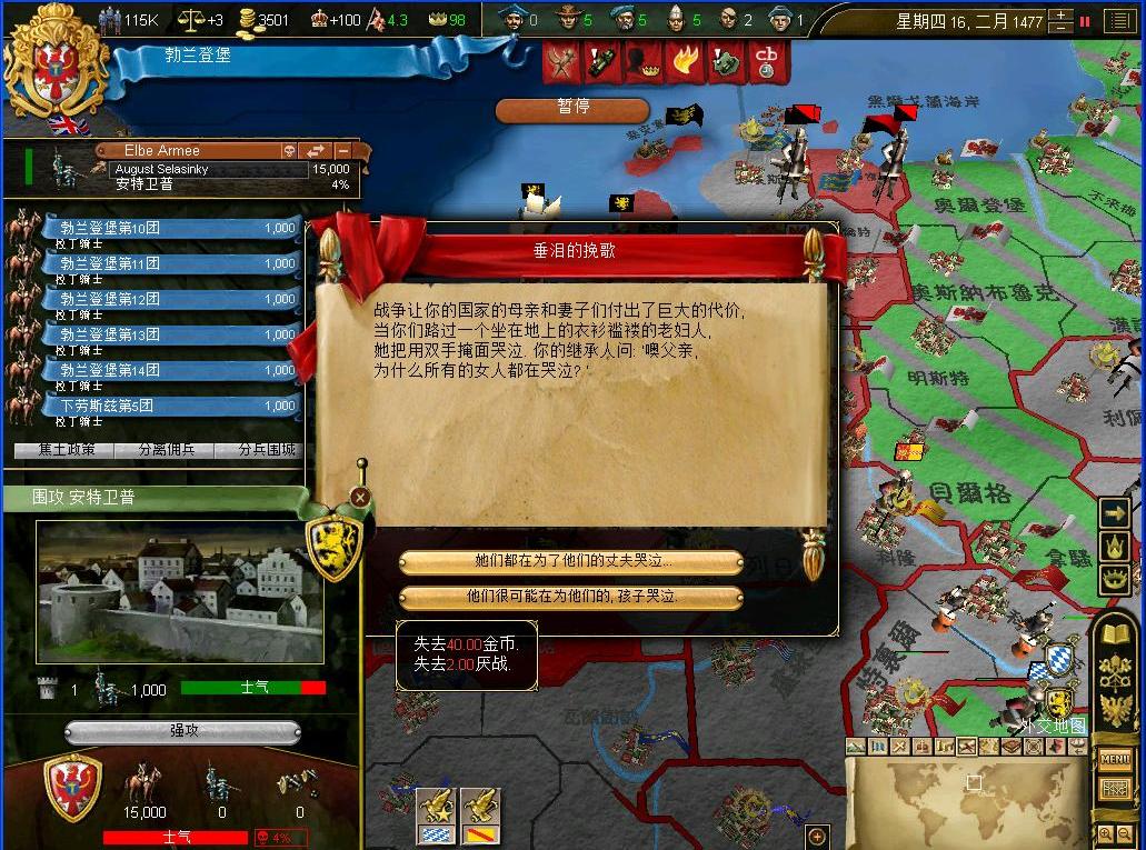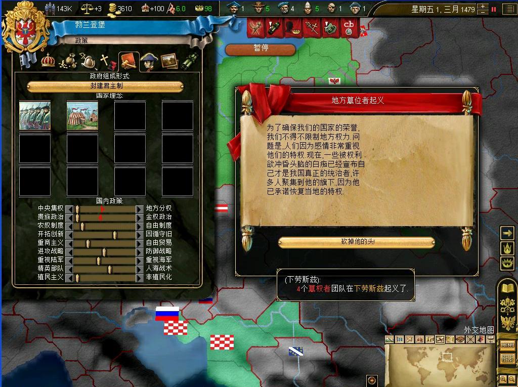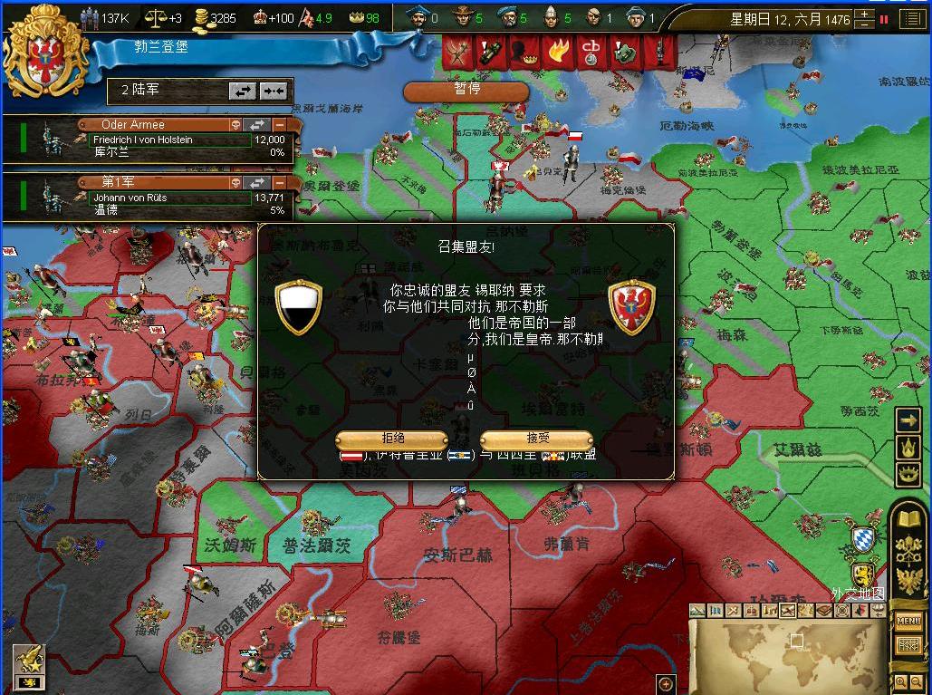 经过了一年多的调整,帝国也从一开始帝国刚刚成立的不稳定期渐渐稳定了下来,而帝国的大军也一定程度上扩军并整编....接下来就是需要继续远征了,这次的目标是卷土重来的黑森公国,原本我们已经把他们打到只有2个省份了,现在居然又有5个了...这个苗头不好,抓紧趁着有理由,宣战之...