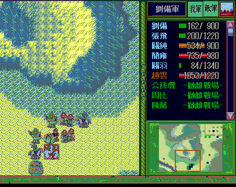 我 藩宫右上攻 简雍右下漩涡灭弓兵1,赵云上攻 关纯右上射灭骑兵1,张飞右攻灭军乐队1,关羽左方牵制(失败) 刘备右攻步兵1;