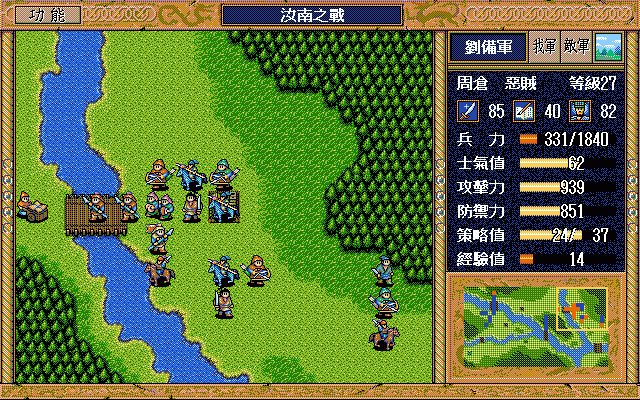 我 刘备右攻 简雍右上漩涡灭弓兵3,关羽下方(成功) 张飞右方牵制夏侯惇(成功),赵云右1下2激励自己,藩宫下方火龙(成功) 关纯右方两格火龙书灭李典;