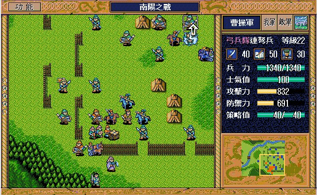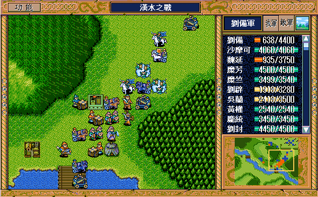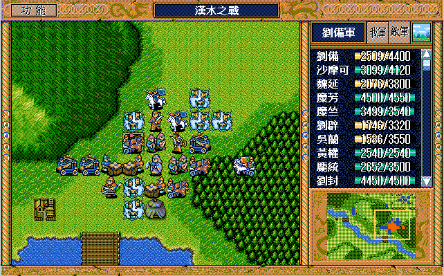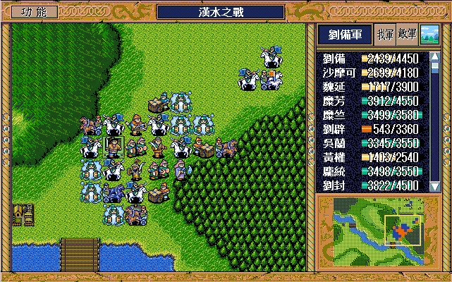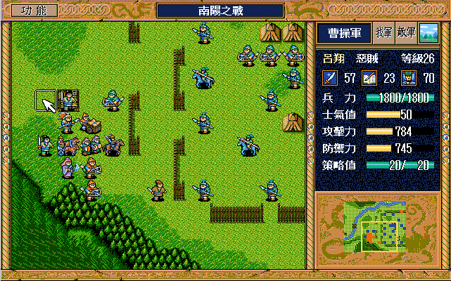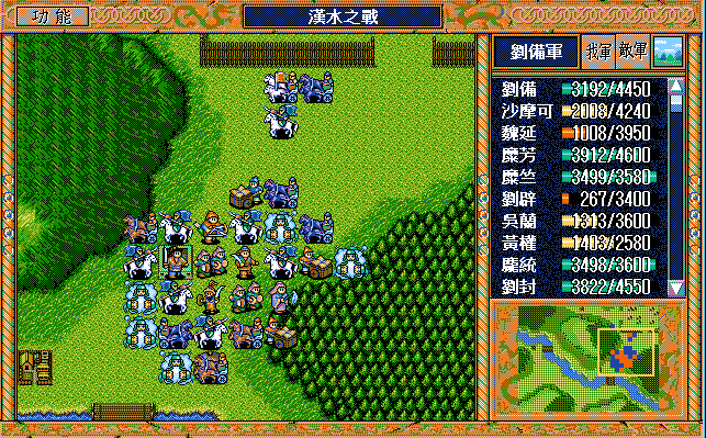 敌 步兵1(清醒)开始火龙沙摩可,曹彰上、骑兵9左攻击刘备。