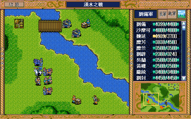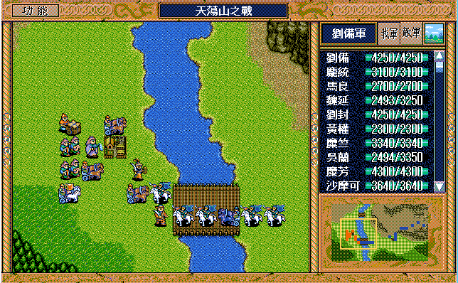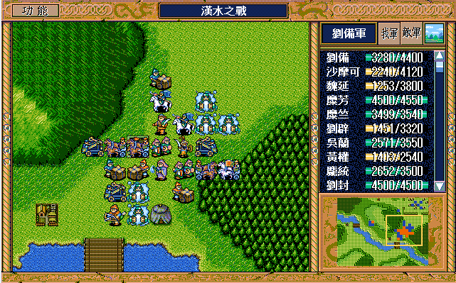 我 吴兰右二下一,魏延左一上一开始大火龙(本回合伤害步兵5),沙摩可上一开始(后不说明都是)大漩涡(本回合伤害步兵5,伤害步兵4二回合),庞统右二上一大火龙(二回合,本回合伤害步兵5),王平右二上一援助、糜竺上激励(从此不变位置)、刘封进宝物库援助王平(并拿1000金),糜芳进鹿砦援助、马良下方两格补给魏延,黄权右激励糜芳(从此不变位置),张飞左激励马良,刘备右下假情报曹洪,刘辟左四上一;