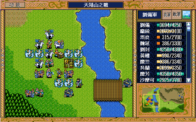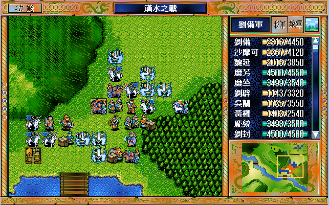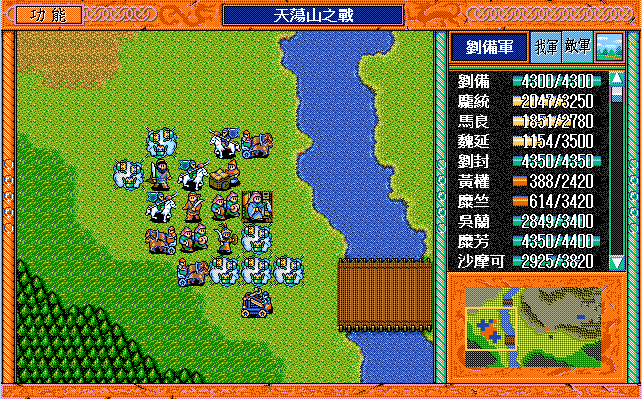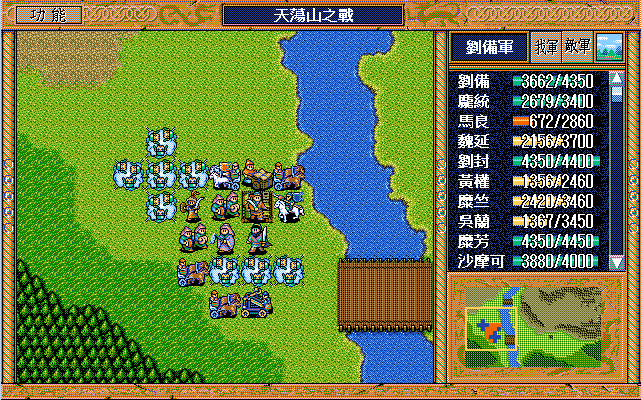 我 吴兰右三上一,糜芳原地假情报运输队2,黄权激励张飞,张飞原地假情报步兵1,马良原地救济魏延(反正策略值要补满),糜竺激励沙摩可,王平下二援助自己,刘封右下援助马良(二回合),刘备右二援助自己,刘辟左三下一;