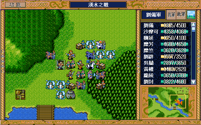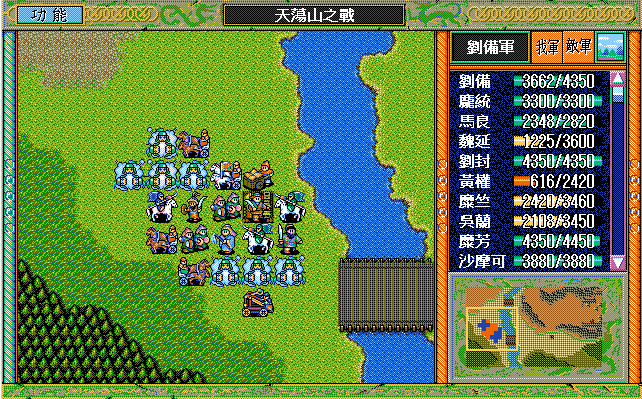 我 刘辟右二下二援助、刘封右下援助、黄权右交援军报告给刘辟,糜芳上激励、马良右下援助黄权,刘备右二上二援助、张飞左下激励刘备,庞统下牵制、魏延原地攻击步兵2,糜竺原地激励、吴兰下援助糜竺,沙摩可左下焦热书骑兵2;