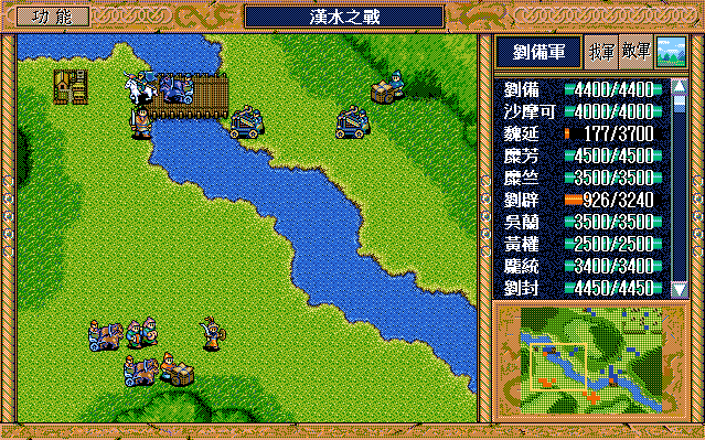 敌 骑兵6左下牵制或挑拨刘辟(成功),运输队1左三大救济,骑兵8上攻击吴兰。
