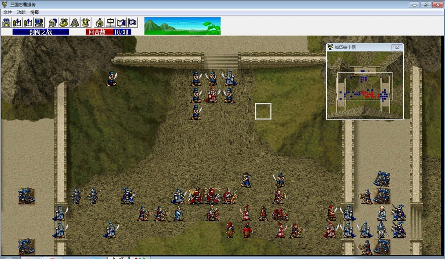 把马岱队和南蛮队消灭之后(或者是我军到达东/西关门口,我没仔细看触发条件),关内山地上的第二波伏兵由会出现,而且关卡里面的敌人也会全军出击了。要赶在敌军出击之前,让许褚和曹洪堵住关口(当然要先加防),这样许褚在山地有110%的加成,曹洪是S的防御,可以把东关的敌军全压制在关口,防止敌人全冲出来,攻击力过强。另一边张辽夏侯惇占住关隘内的兵营和鹿砦,缓慢的消耗从西关杀出的敌军。而山地上的伏兵,由于只能攻击到乐进,全部围在这个A攻S防的人周围,让乐进好好升了一把级。因为骑兵们在兵营鹿砦内有能力加成,否则这些贼兵很可能会放弃乐进而去打骑兵的。如下图,曹洪许褚堵东关,乐进堵北关,张辽夏侯惇杀西关的人,其他人慢慢往东关杀即可。许褚基本不用攻击,整天在那里咒骂诸葛亮和赵云,等级也升得飞快。