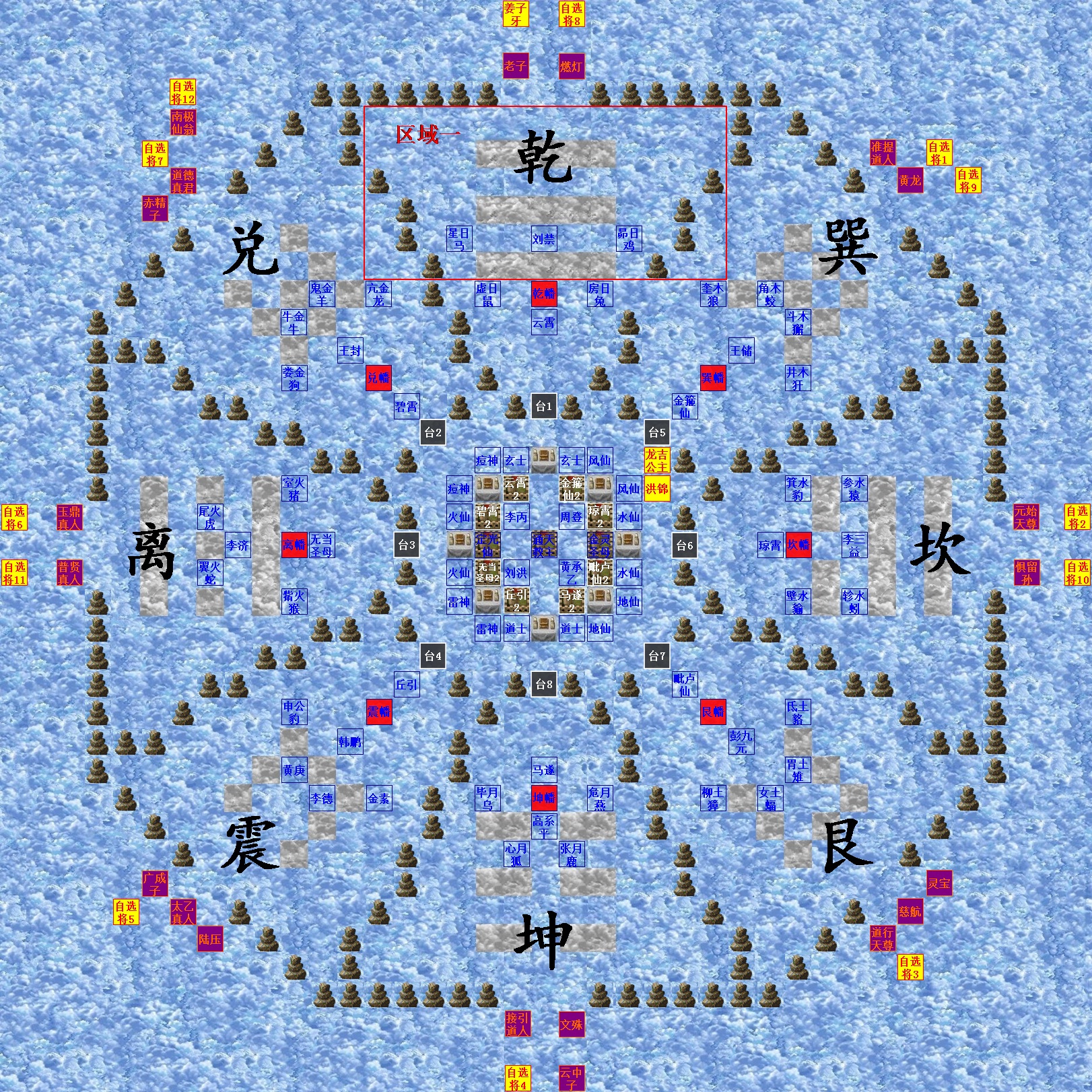 姜子牙和云霄的对话条件,我想是因为游戏设定范围时,只能设定方形区域,因此在兑阵和巽阵都可以触发两人的对话。