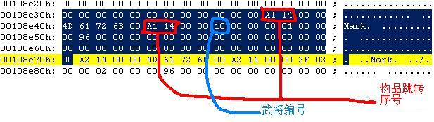 最后用UE打开你的存档,直接找到丁奉的人物数据,他的第一个物品的跳转序号为A1 14